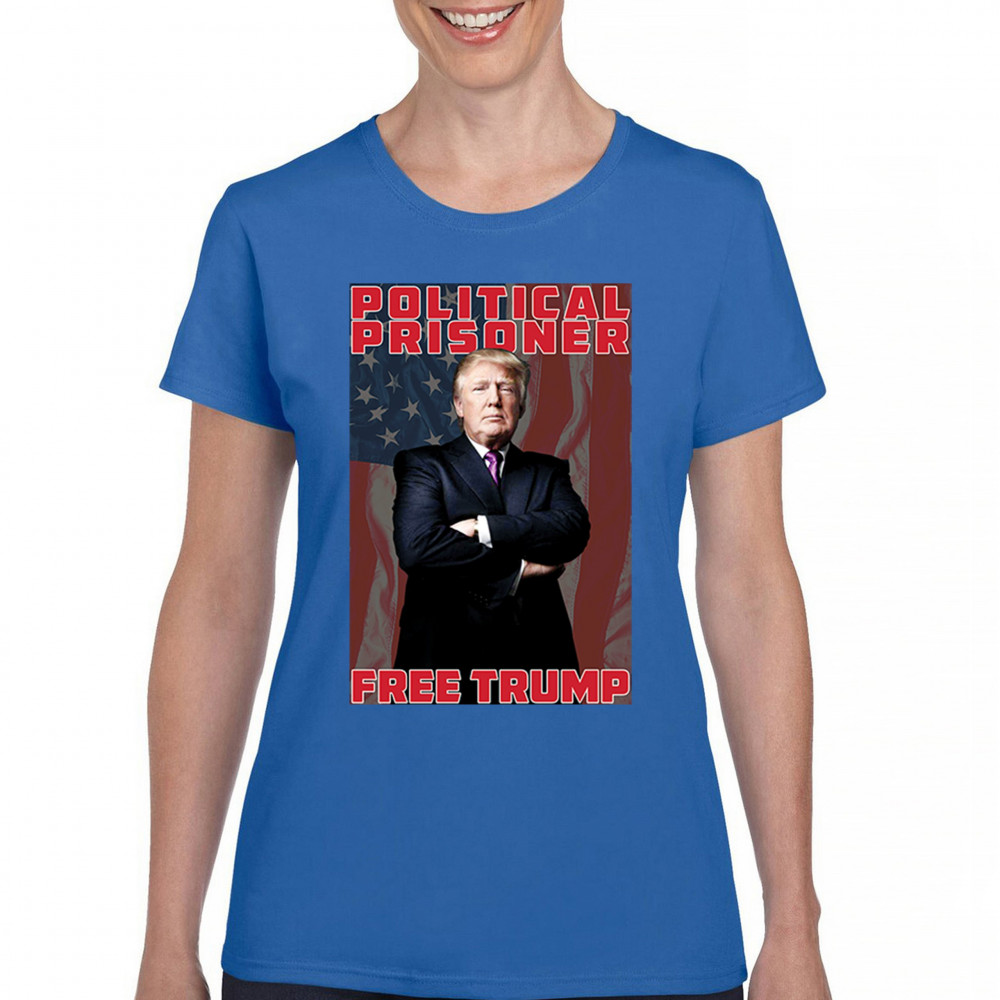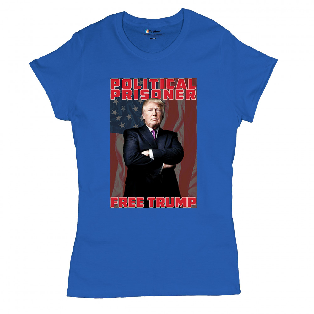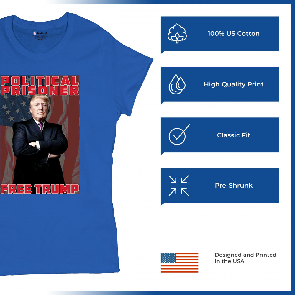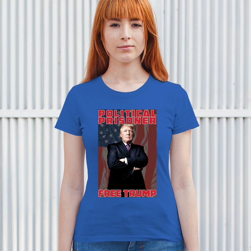 Show your support with the "Political Prisoner Free Trump" design, featuring Trump against an American flag. Perfect for conservative patriots and Trump supporters.