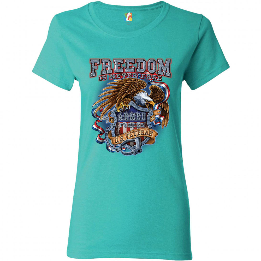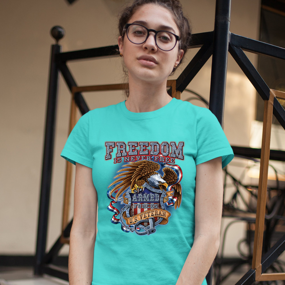 FREEDOM IS NEVER FREE t-shirt u.s. veteran armed forces military women's tee light blue