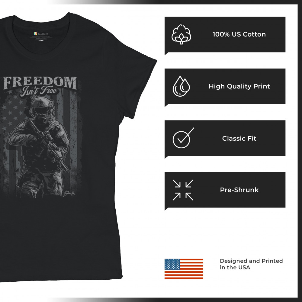 This bold design honors the brave who defend our freedom. Featuring a detailed graphic of an armed soldier against a distressed American flag, it’s perfect for military families, veterans, and patriots alike. Whether you’re wearing it for Memorial Day, Independence Day, or just to show pride, it reflects sacrifice, duty, and American strength.