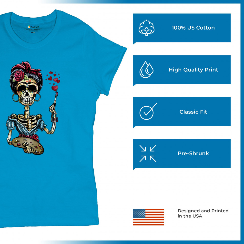 FRIDA KAHLO SUGAR SKULL t-shirt calavera mexican day of the dead women's tee light blue