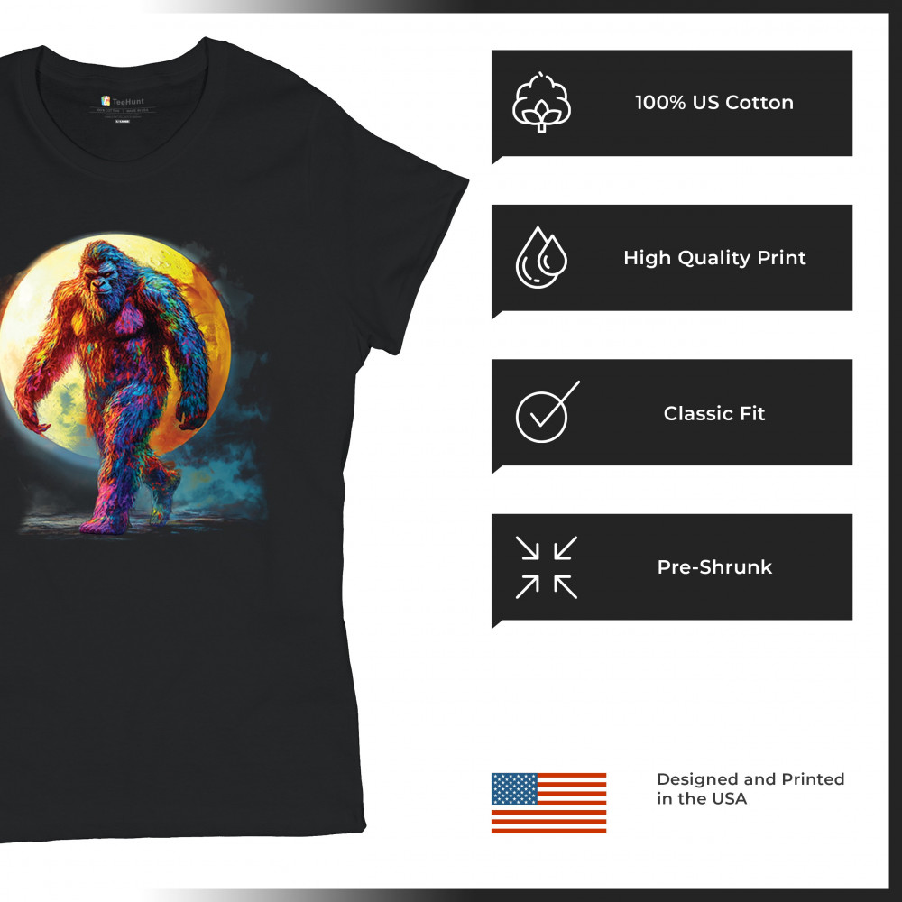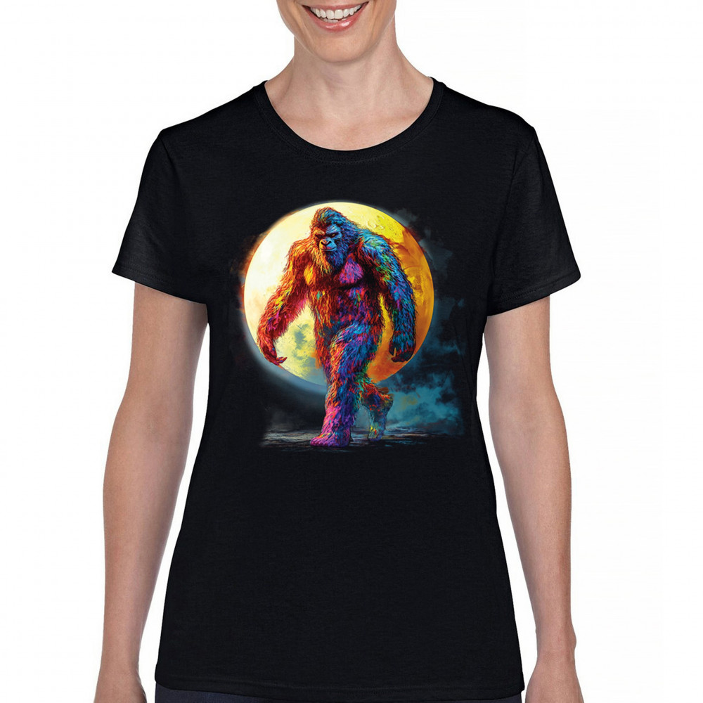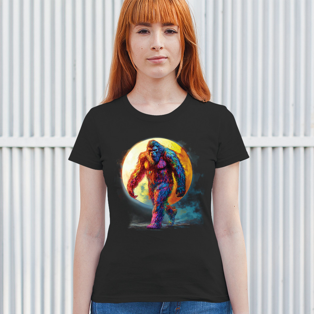 Rainbow Bigfoot under full moon design for cryptid lovers, festival goers, and psychedelic art fans. Bold, surreal, and eye-catching.