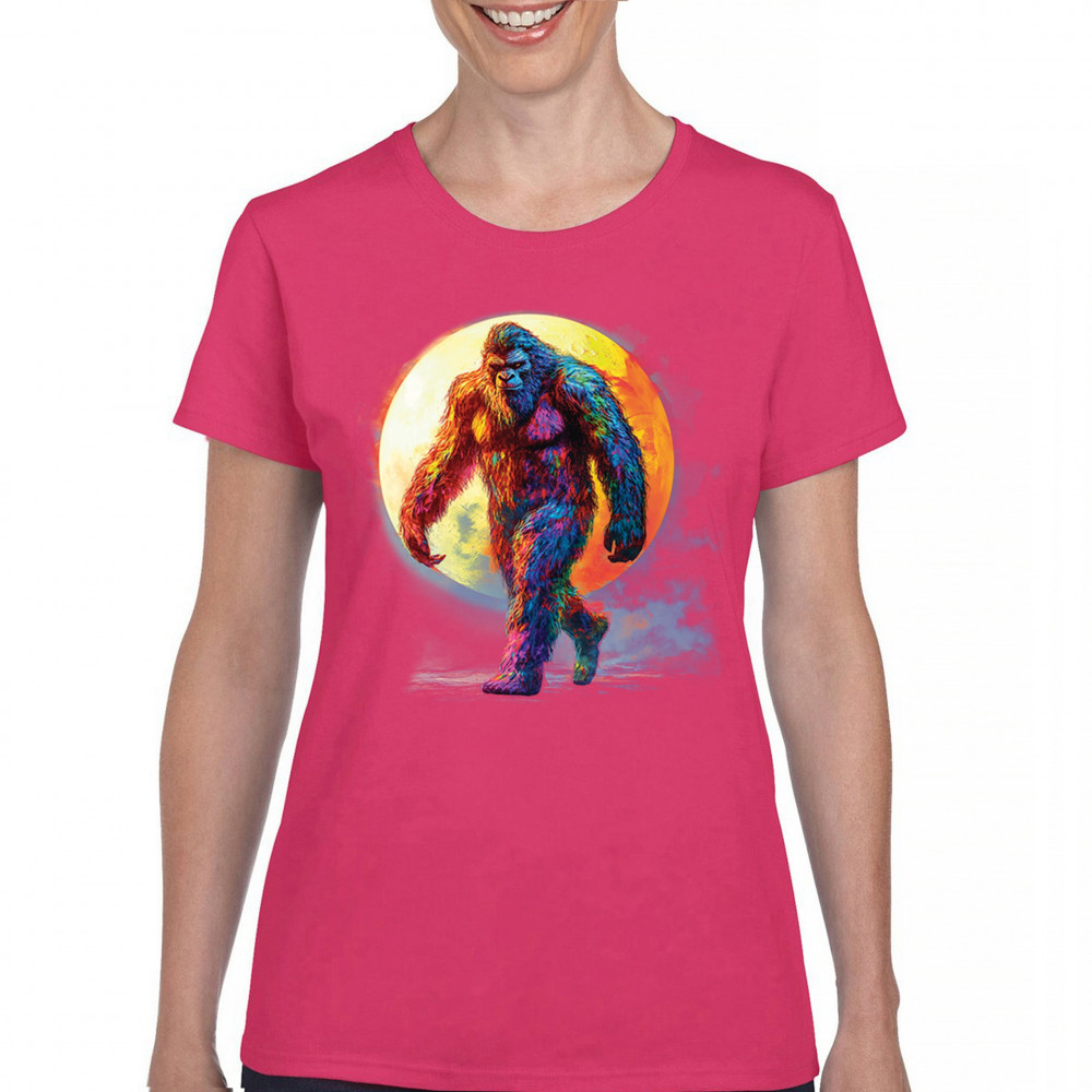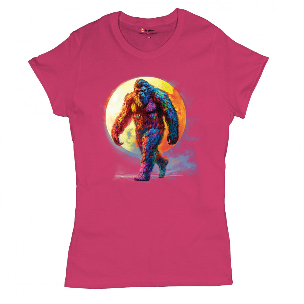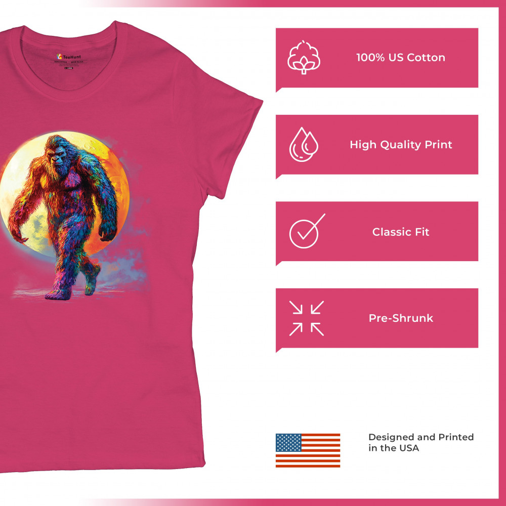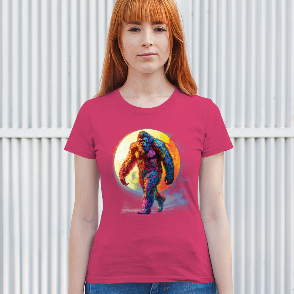 Rainbow Bigfoot under full moon design for cryptid lovers, festival goers, and psychedelic art fans. Bold, surreal, and eye-catching.