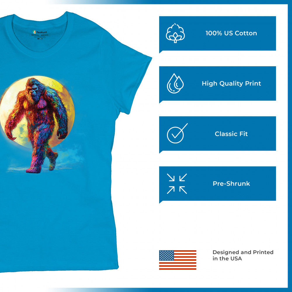 Rainbow Bigfoot under full moon design for cryptid lovers, festival goers, and psychedelic art fans. Bold, surreal, and eye-catching.