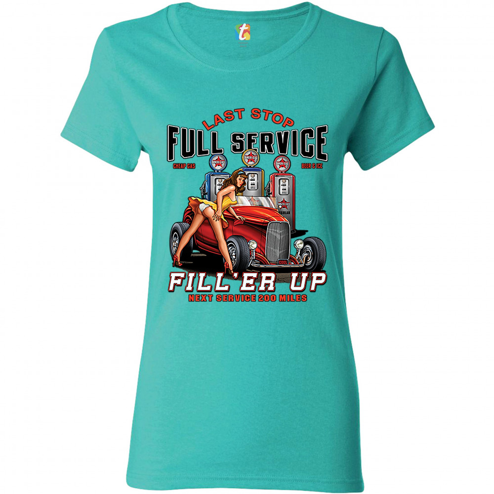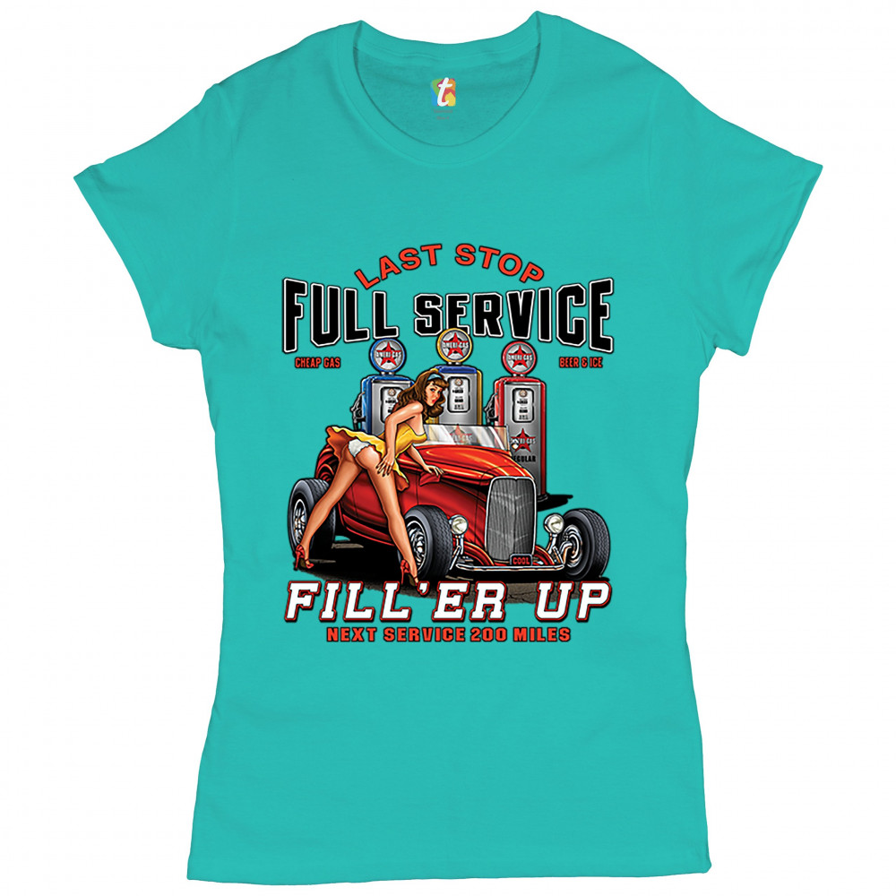 FULL SERVICE FILL 'ER UP t-shirt hot rod pin-up girl old school women's tee light blue