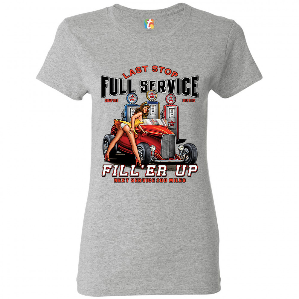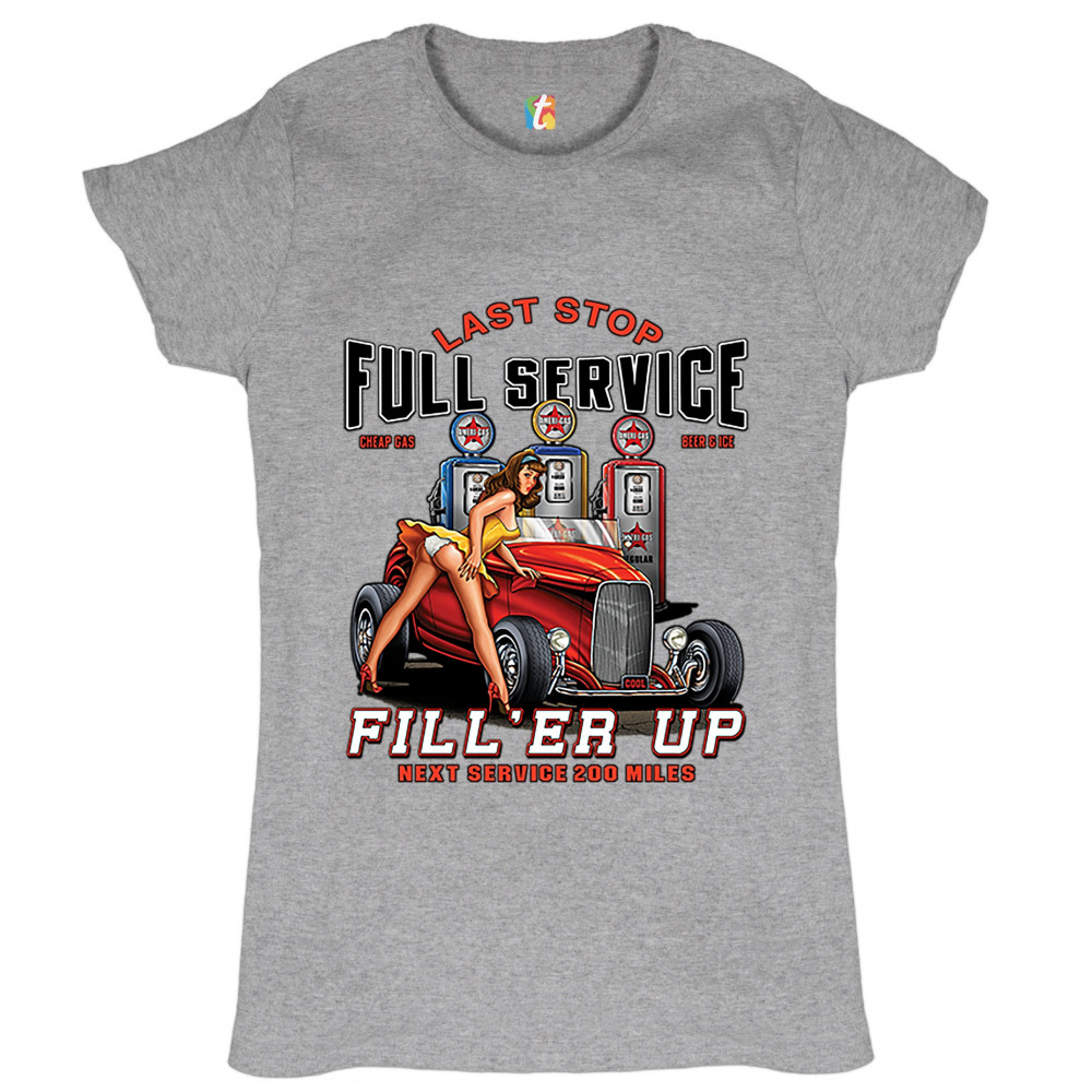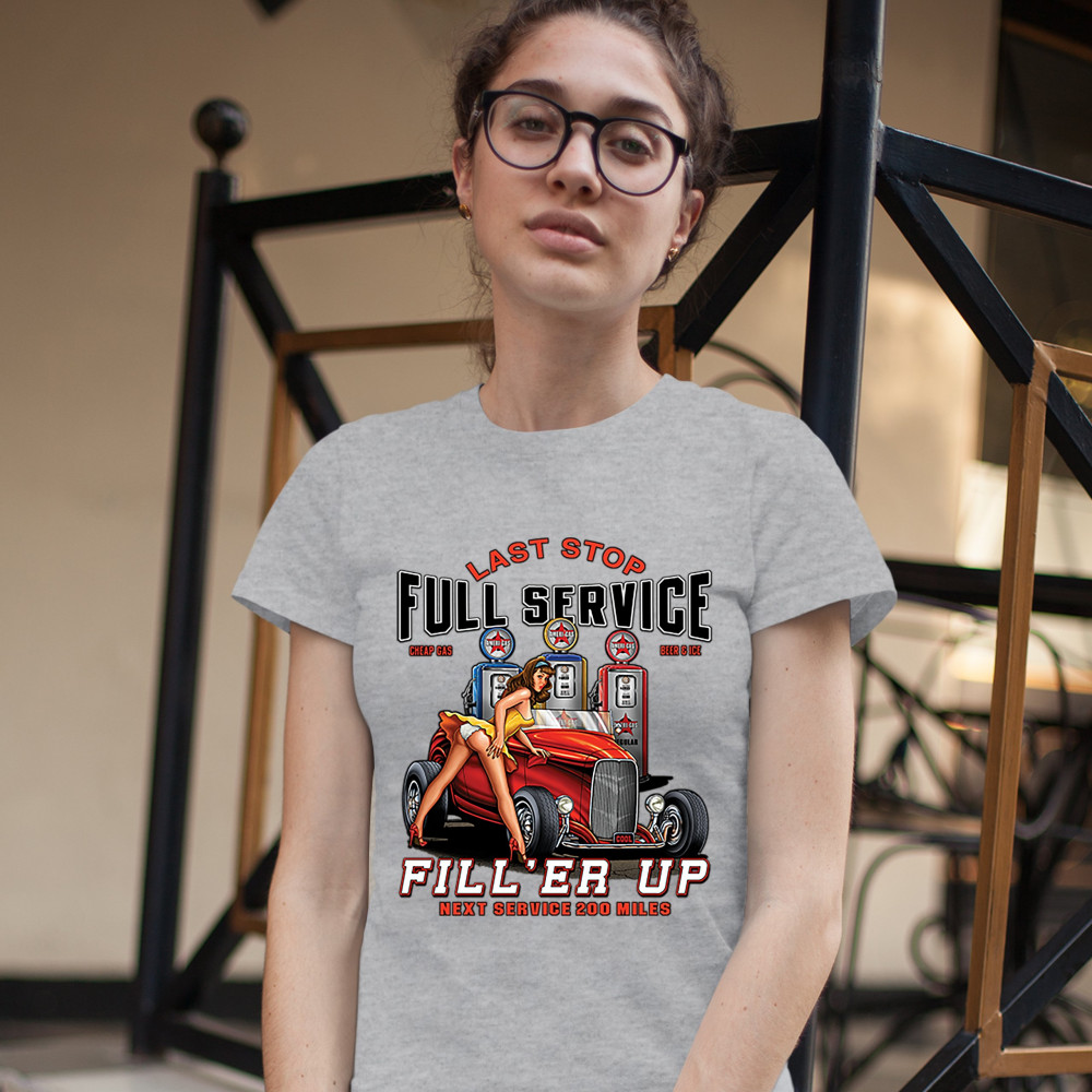 A print featuring a hot pin-up girl leaning on a convertible coupe hot rod with a registration plate saying "cool". In the background there are several gas stations. The print says: "Last Stop, Full Service, Cheap Gas, Beer & Ice, Fill 'Er Up, Next Servic