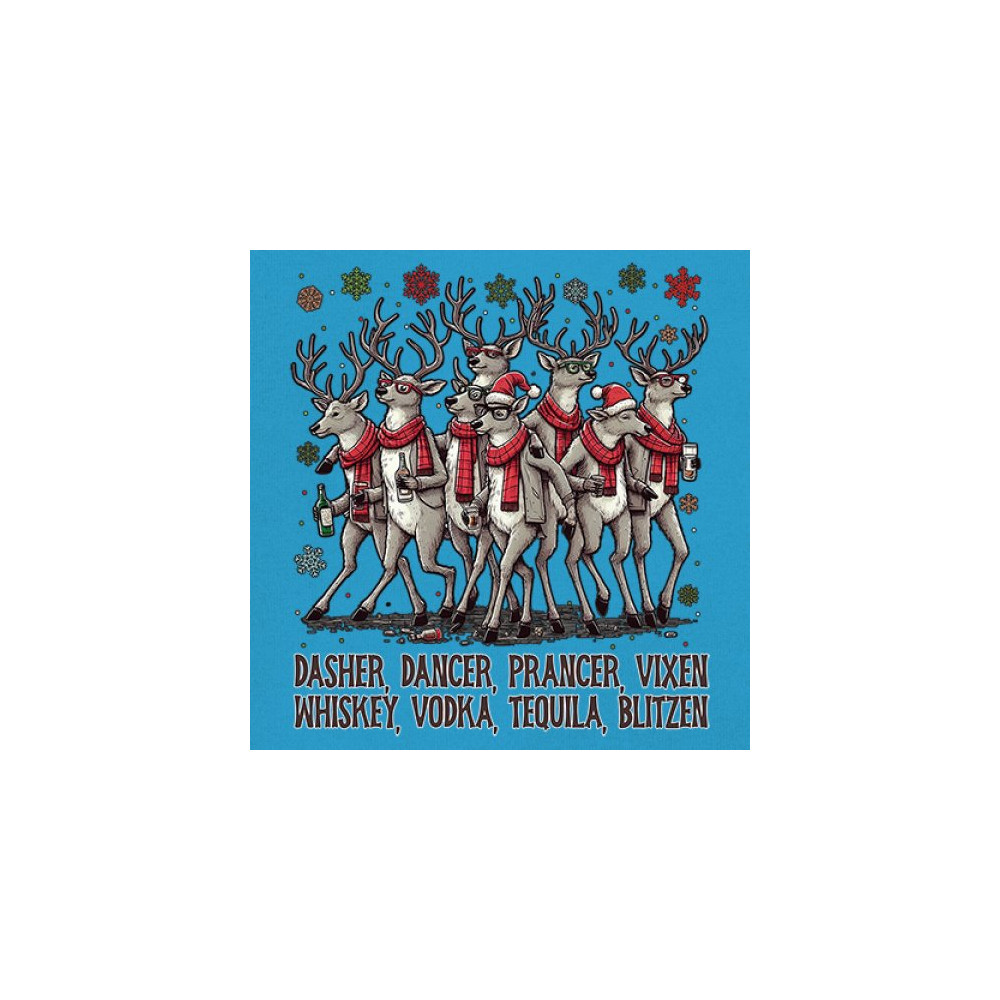 This funny holiday design features a squad of drinking reindeer carrying bottles and dressed in scarves for the ultimate Christmas party vibe. Great for bar crawls, office parties, winter gatherings, adult holiday events, white elephant exchanges, festive nights out, and anyone who loves spirited Christmas humor with a cheeky personality.