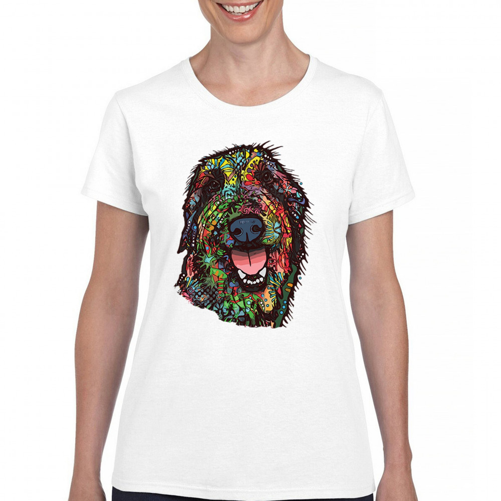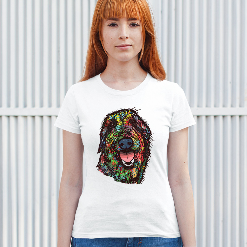 FUNNY FEELING HAPPY DOG FACE t-shirt dean russo cheerful pet women's tee white