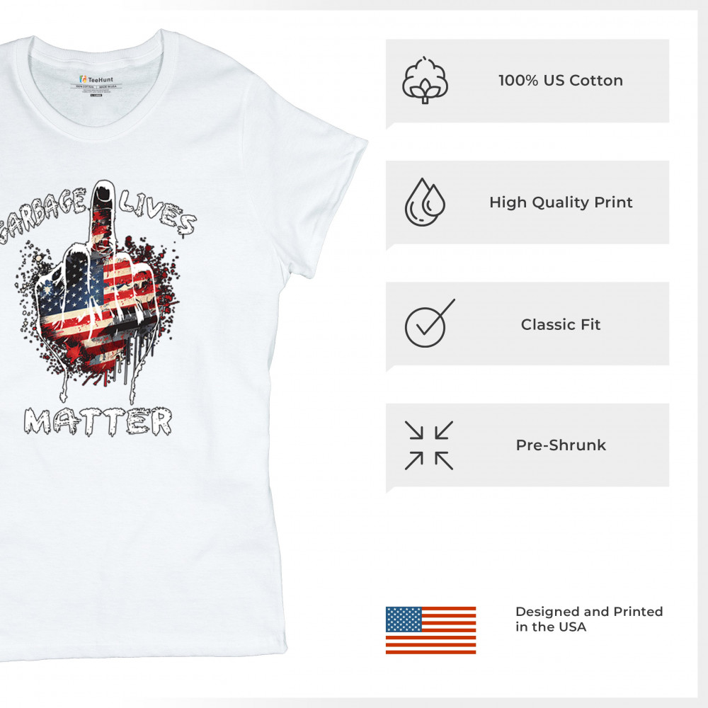 The "Garbage Lives Matter" design is a fearless expression of American values and pride. With the American flag as its centerpiece, this bold and patriotic design speaks volumes to Trump supporters, conservatives, and those who believe in the people's mandate. Join the fight for America First, never surrender, and celebrate the Red Wave movement with this striking statement piece.