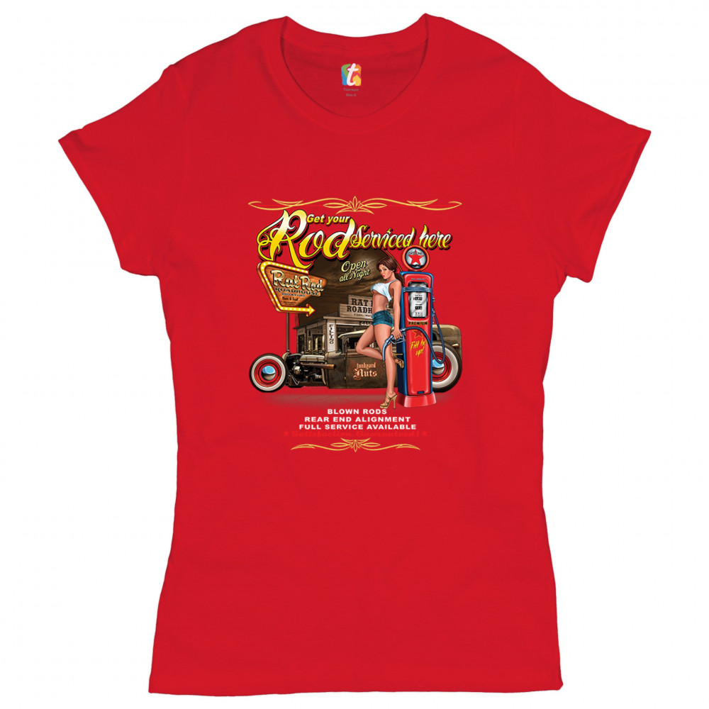 A print featuring a sexy pin-up girl leaning on a gas pump. There is a hot rod behind her and a "Rat Rod Roudhouse" in the background. The print also includes a bunch of innuendos: "get your rod serviced here, blown rods, rear end alignment, full service