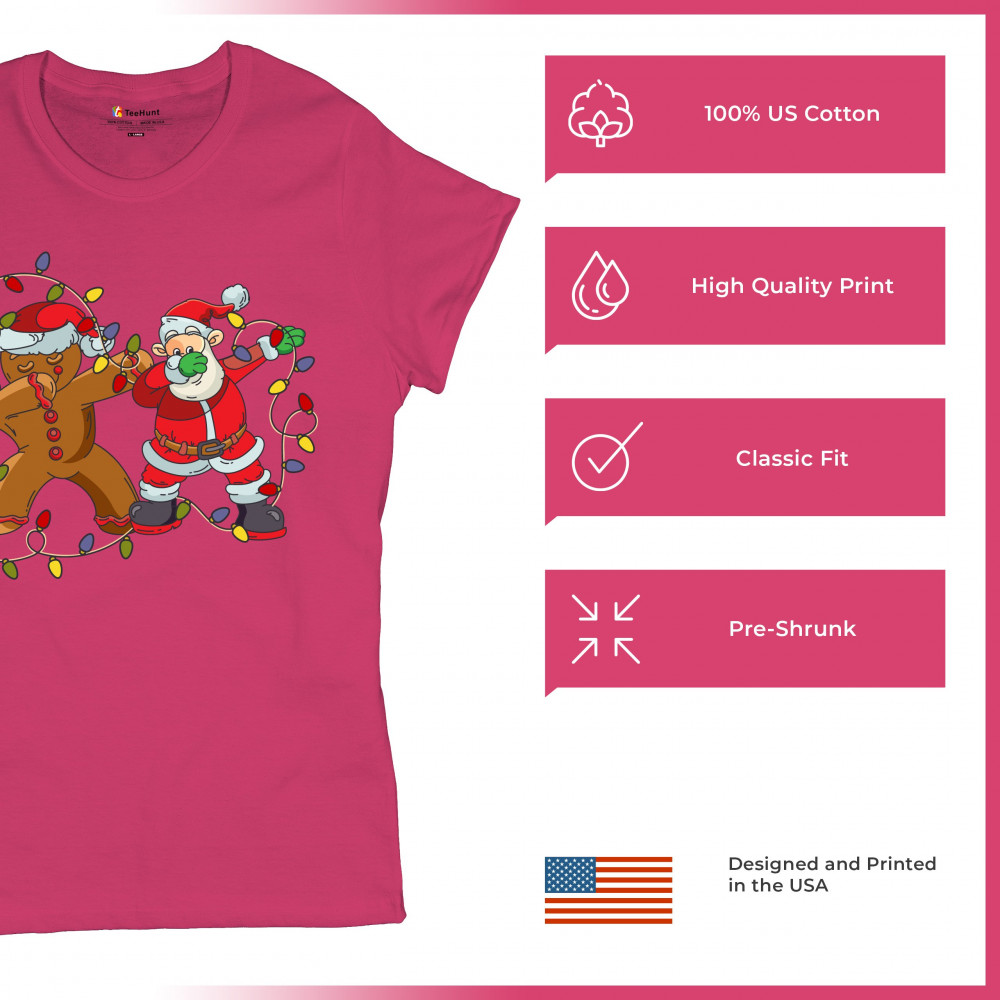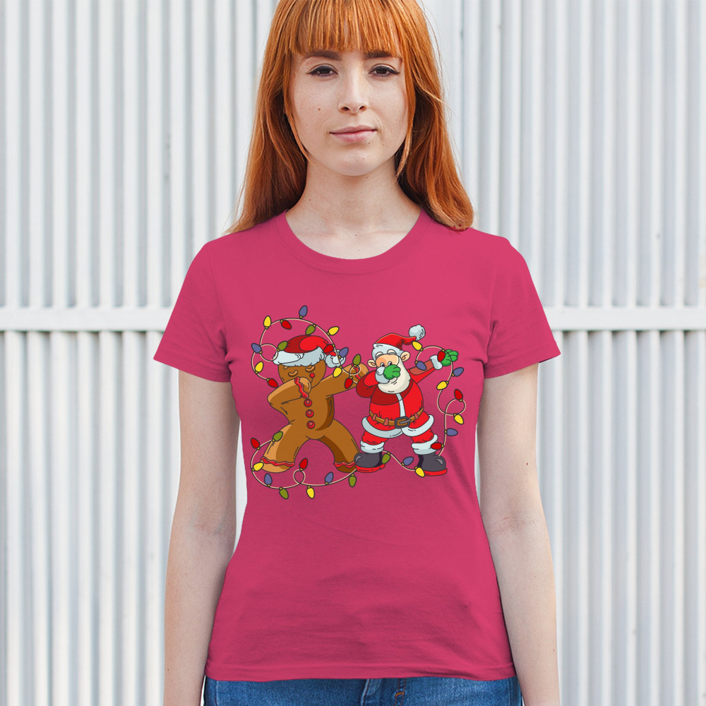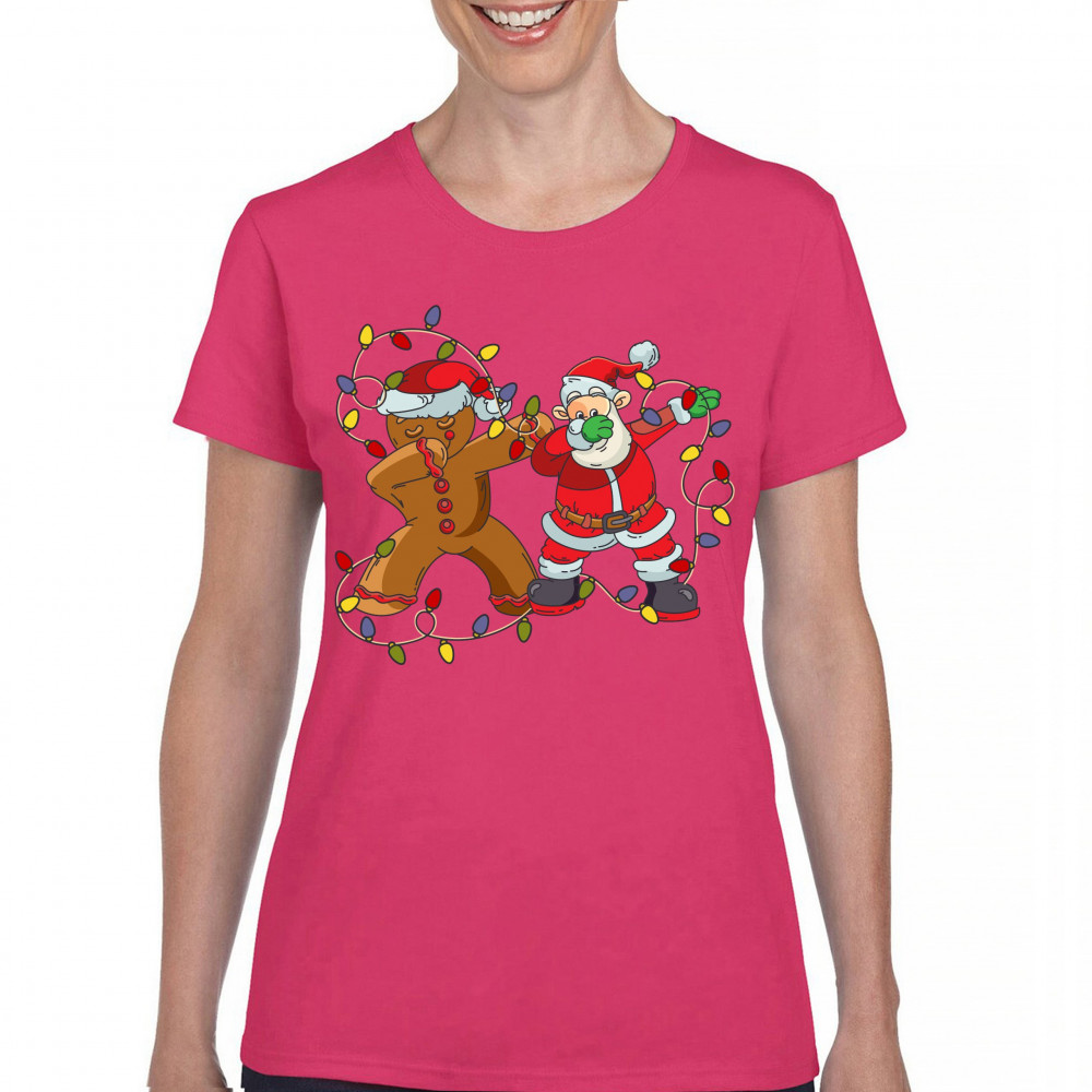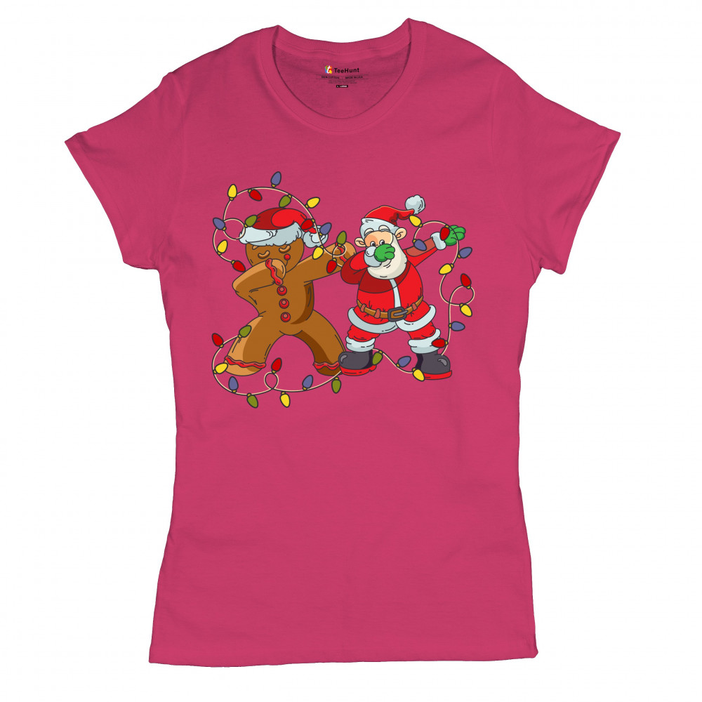 GINGERBREAD MAN AND SANTA CLAUS DAB DANCE t-shirt merry christmas women's tee pink