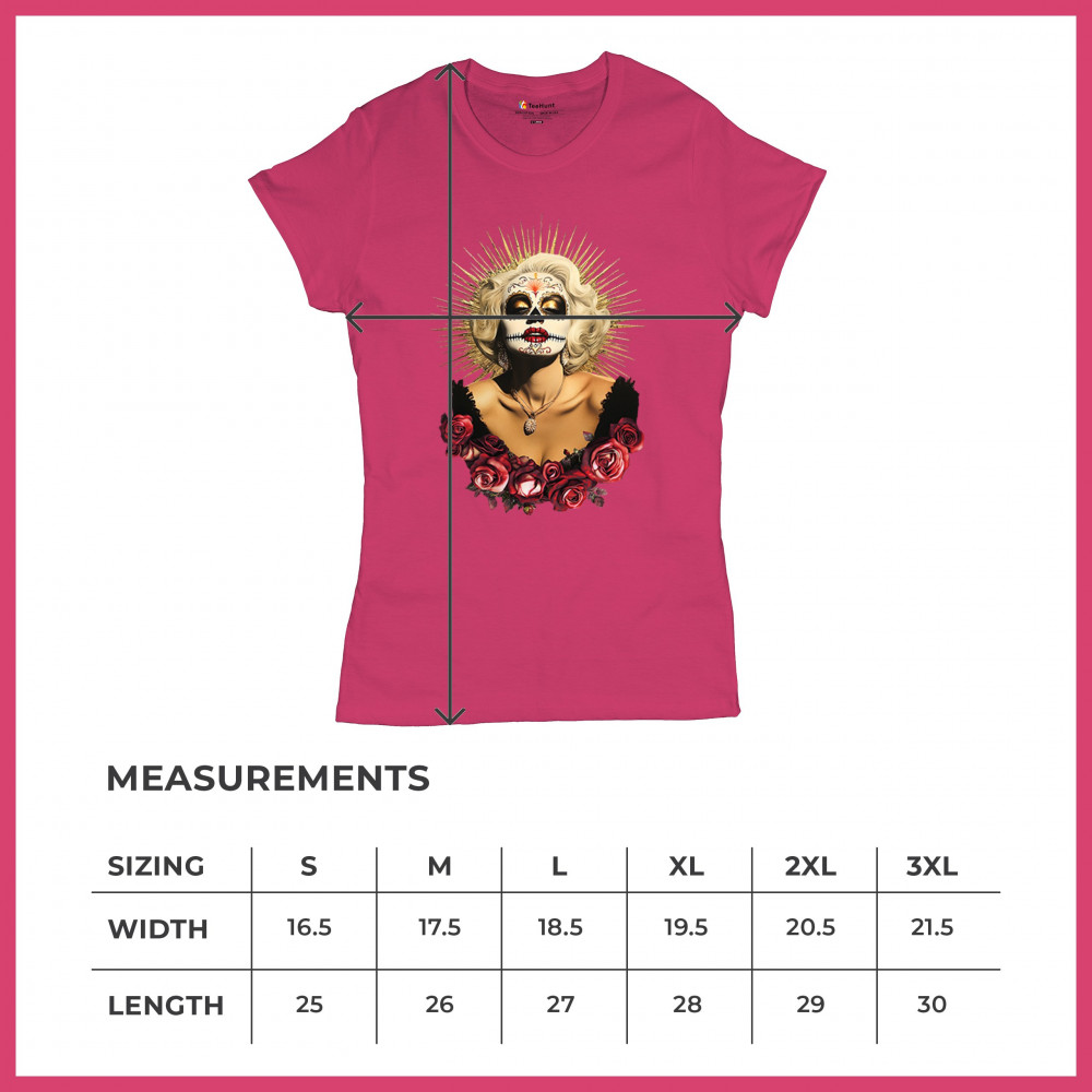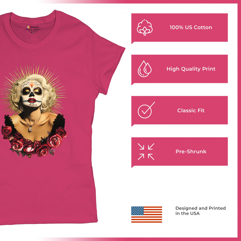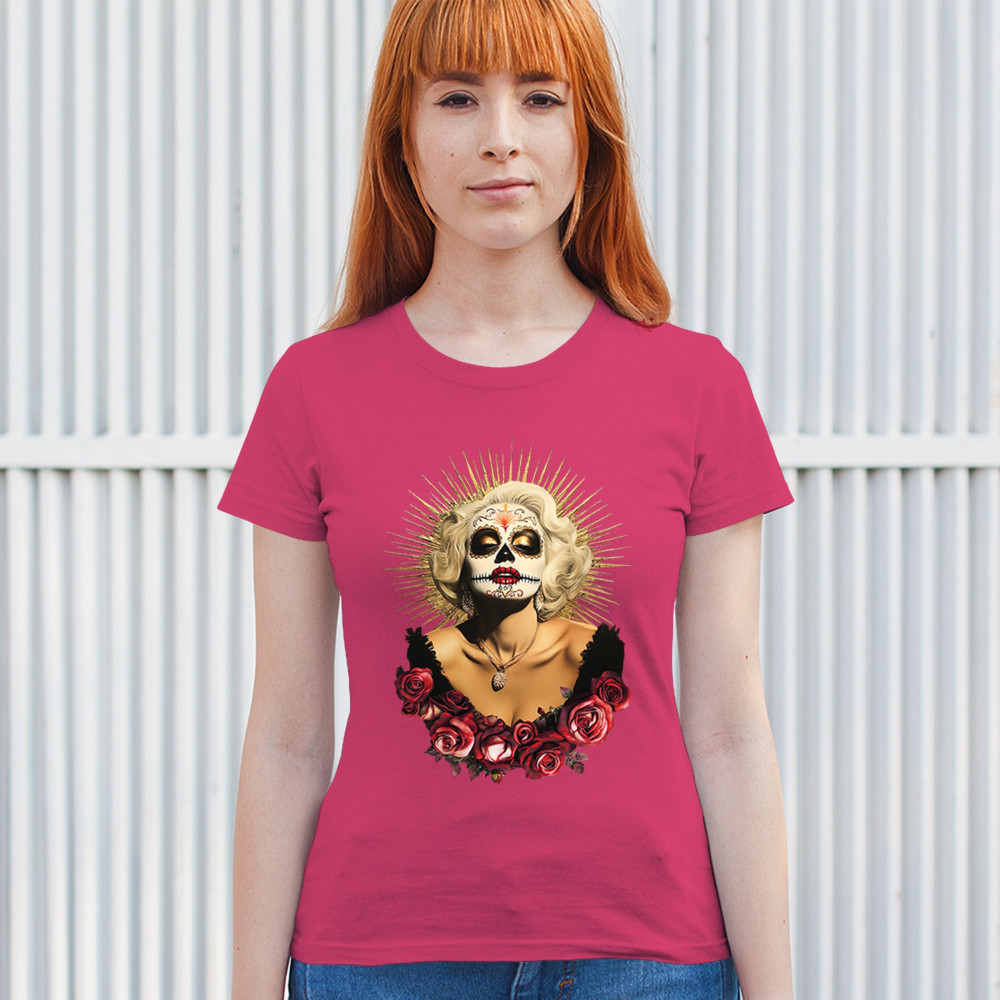This bold and beautiful sugar skull design features a glamorous calavera woman crowned in a golden halo and framed by roses. A divine tribute to Dia de los Muertos, this look blends vintage glam, Latin culture, makeup artistry, and sacred symbolism. Perfect for fans of gothic beauty, Halloween, and heritage expression.