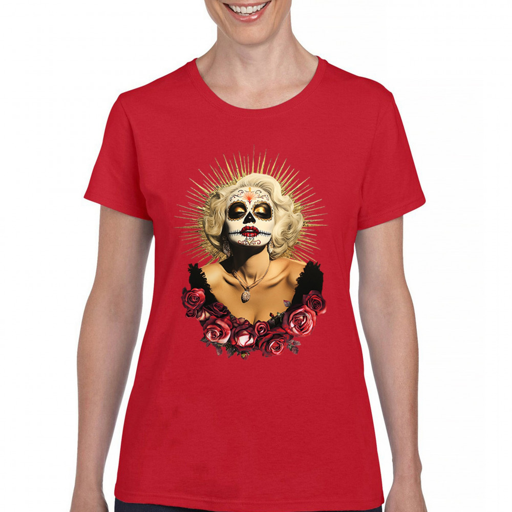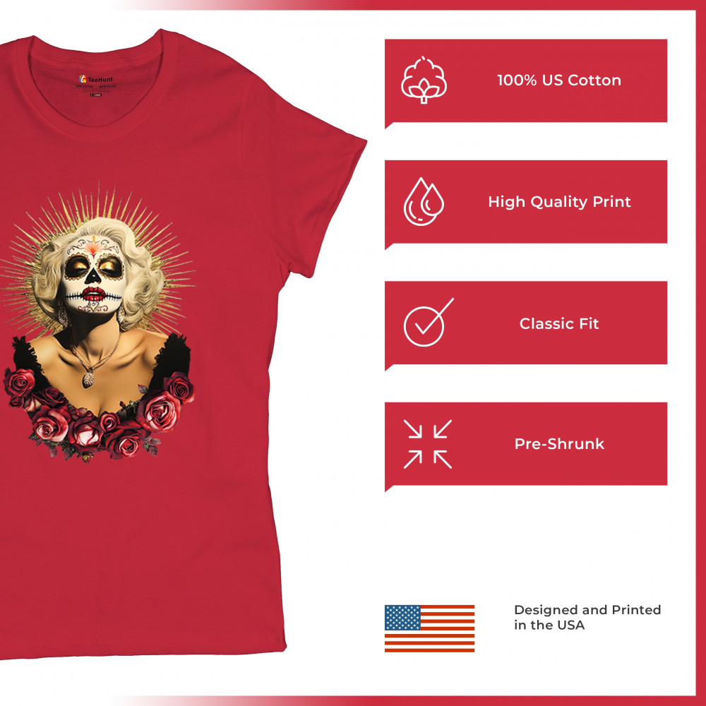 This bold and beautiful sugar skull design features a glamorous calavera woman crowned in a golden halo and framed by roses. A divine tribute to Dia de los Muertos, this look blends vintage glam, Latin culture, makeup artistry, and sacred symbolism. Perfect for fans of gothic beauty, Halloween, and heritage expression.