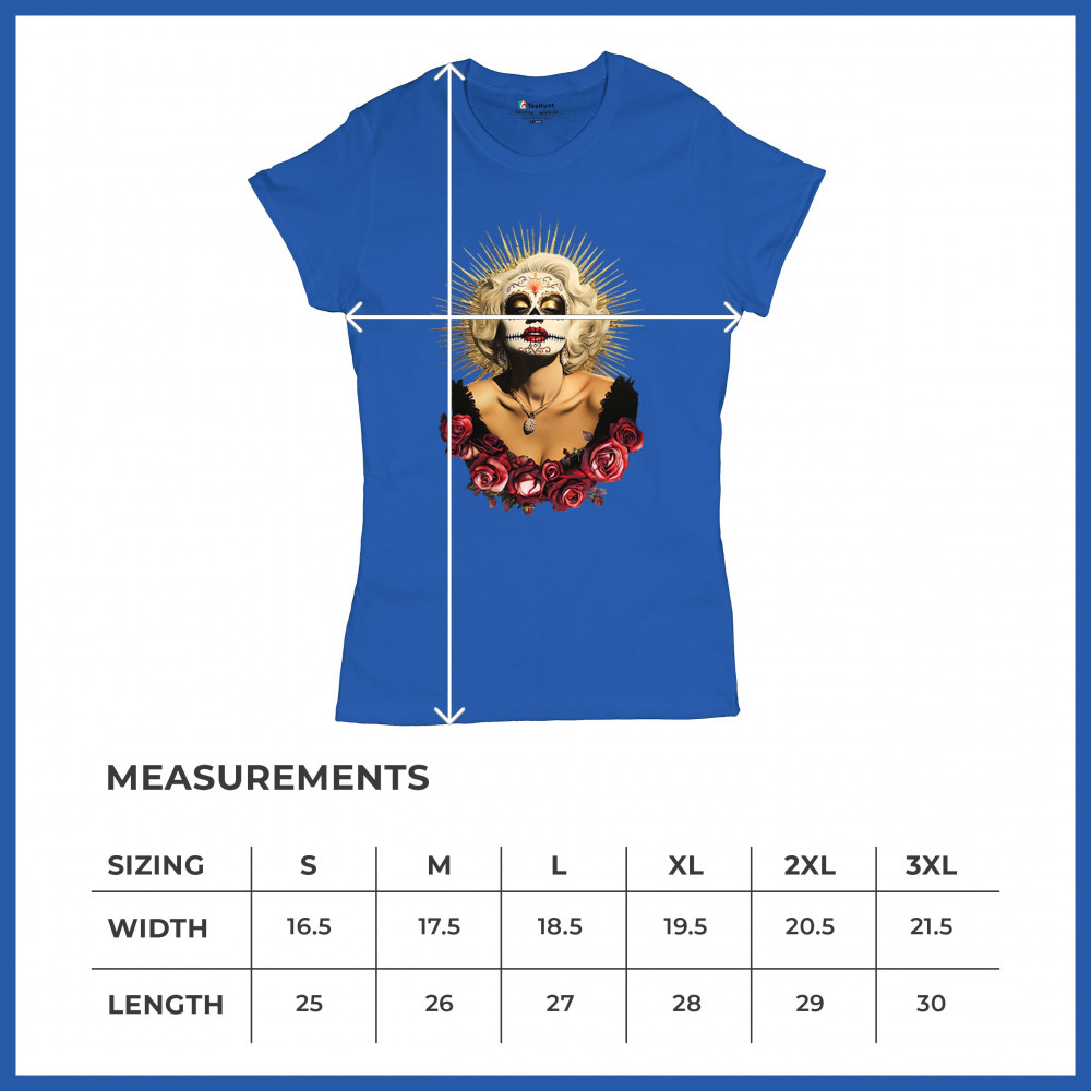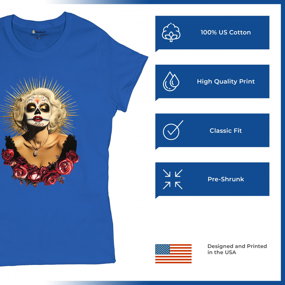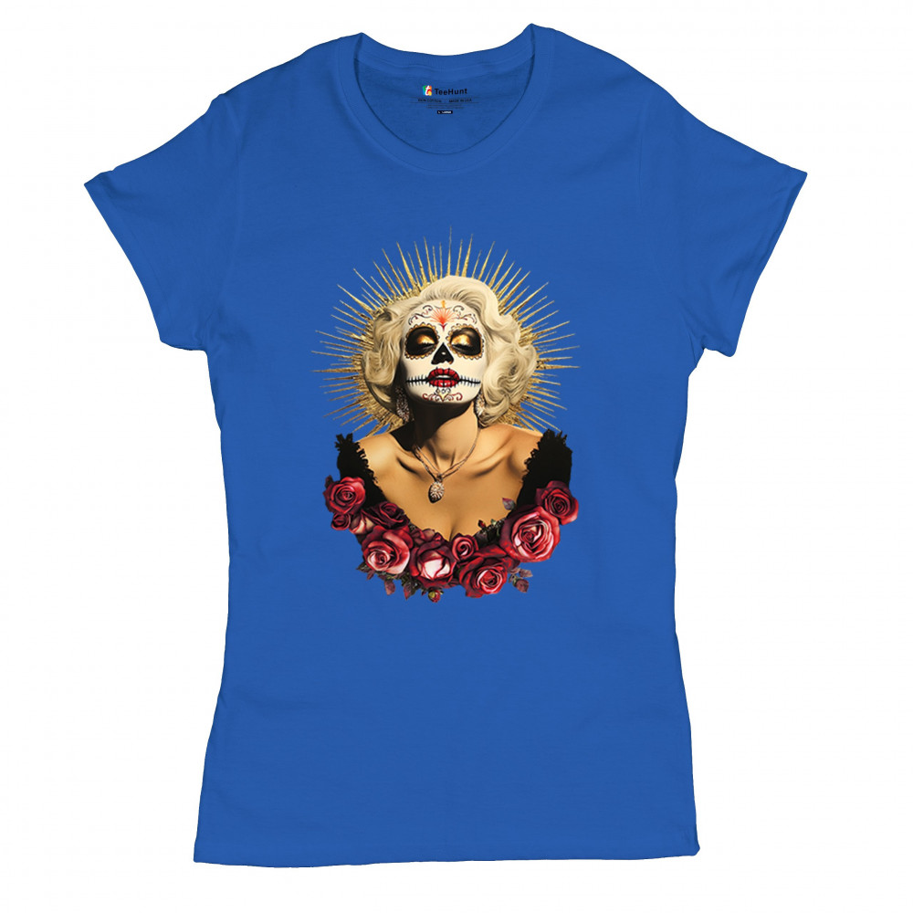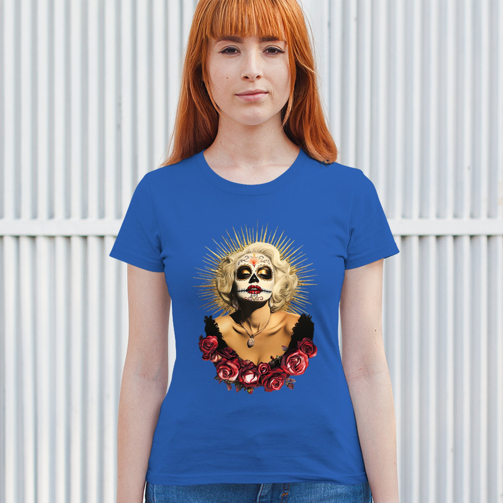 This bold and beautiful sugar skull design features a glamorous calavera woman crowned in a golden halo and framed by roses. A divine tribute to Dia de los Muertos, this look blends vintage glam, Latin culture, makeup artistry, and sacred symbolism. Perfect for fans of gothic beauty, Halloween, and heritage expression.