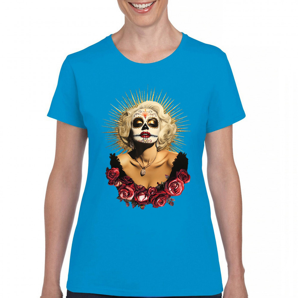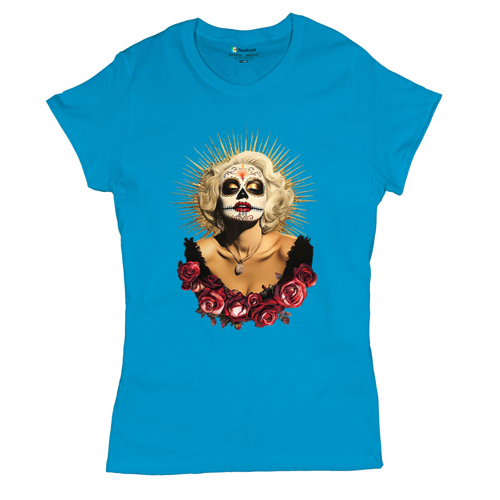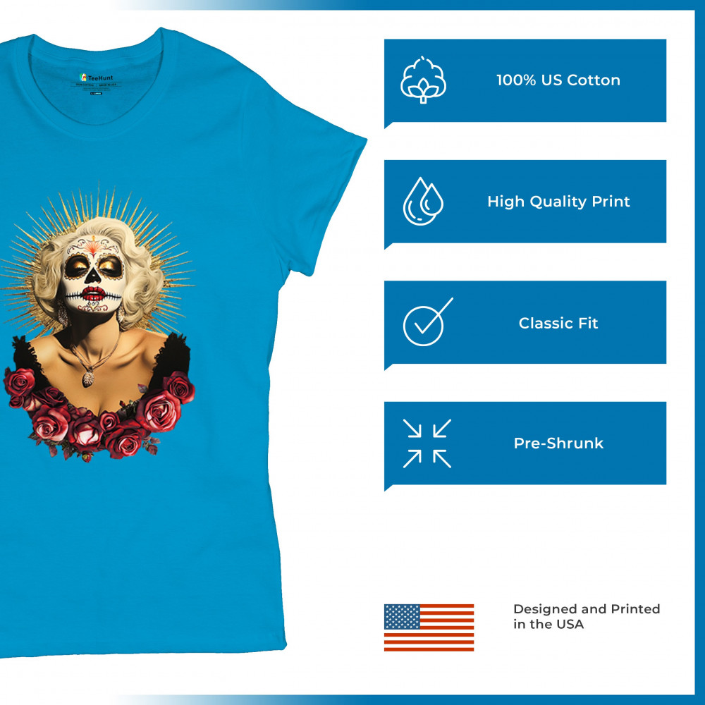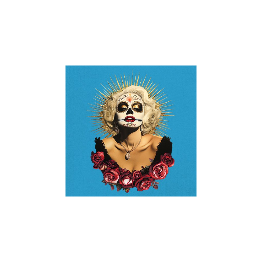 This bold and beautiful sugar skull design features a glamorous calavera woman crowned in a golden halo and framed by roses. A divine tribute to Dia de los Muertos, this look blends vintage glam, Latin culture, makeup artistry, and sacred symbolism. Perfect for fans of gothic beauty, Halloween, and heritage expression.