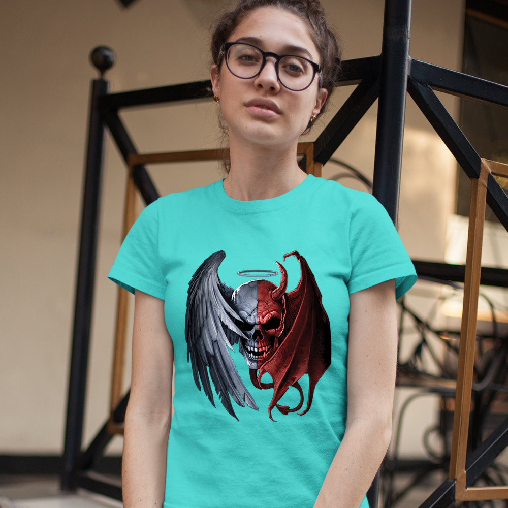 A print featuring a skull face, one half of which is light and has an angel's wing covering it and the other is dark with a horn sticking out of the forehead and a demon's wing. Below the skull you can see a demon's tail and a halo above it. A great