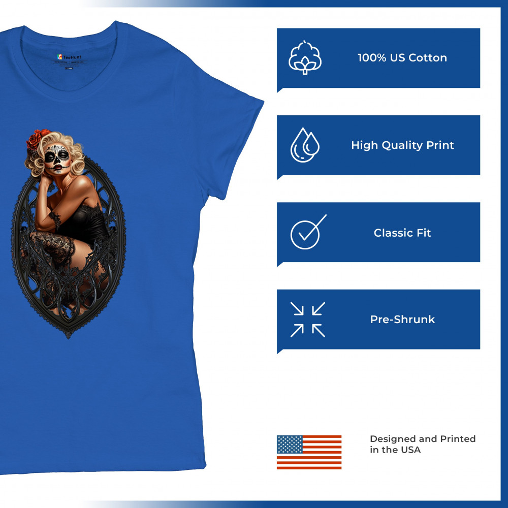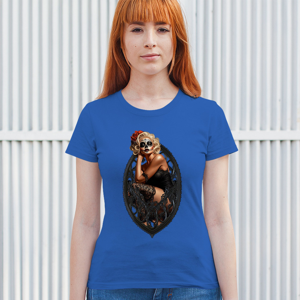 This sultry sugar skull pinup design blends gothic lace, seductive pose, and ornate frame detail for a bold Day of the Dead tribute. With striking makeup and vintage lingerie styling, it’s perfect for fans of macabre fashion, calavera art, and dark romance. A hauntingly beautiful mix of allure, attitude, and Dia de los Muertos charm.
