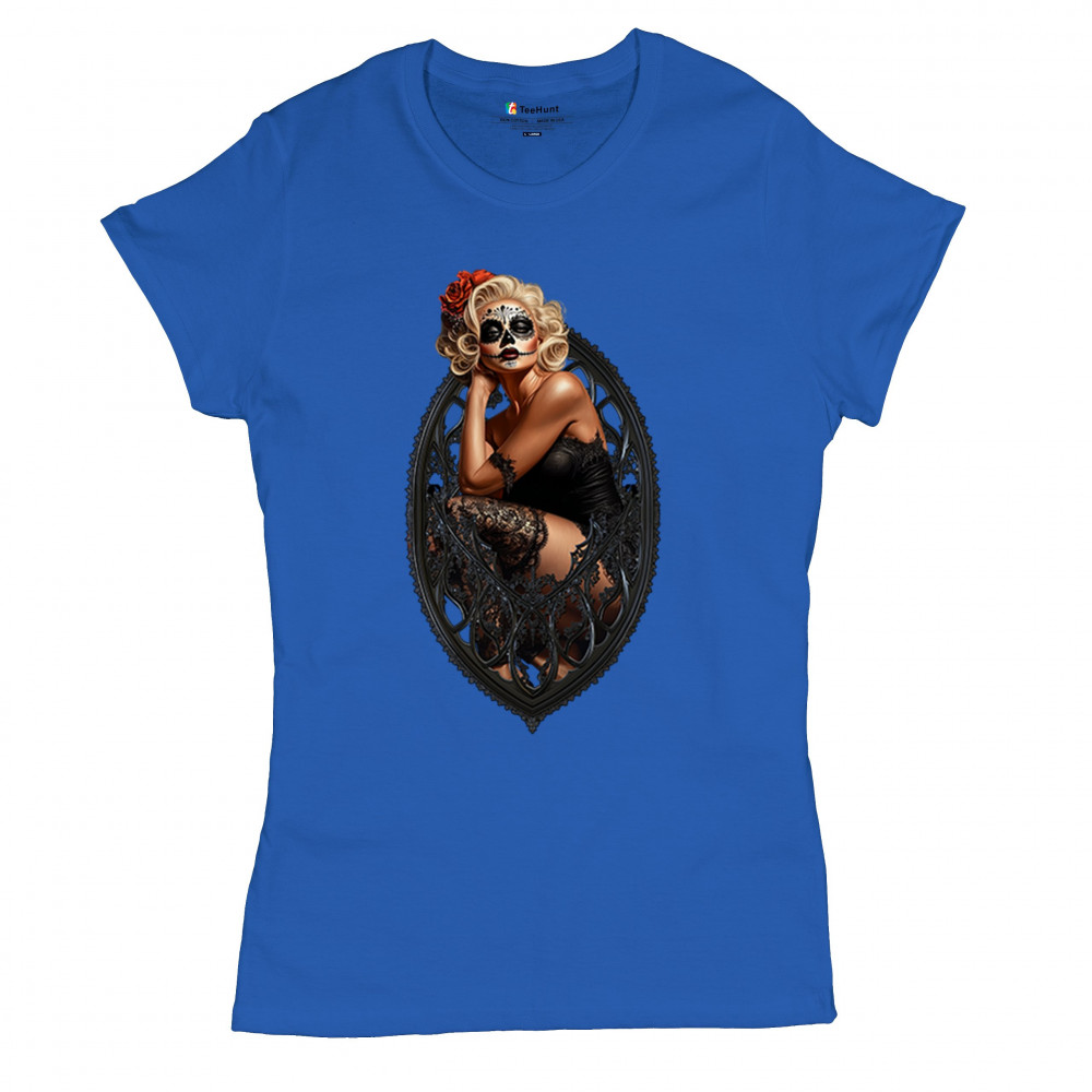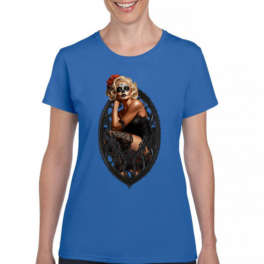 Sultry sugar skull pinup with gothic lace and ornate frame. Perfect for lovers of calavera fashion, dark romance, and vintage pinup style.