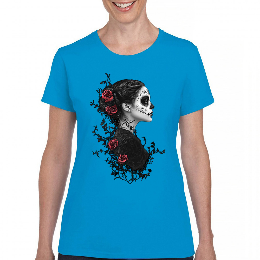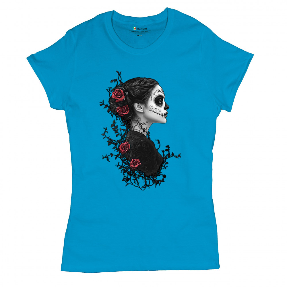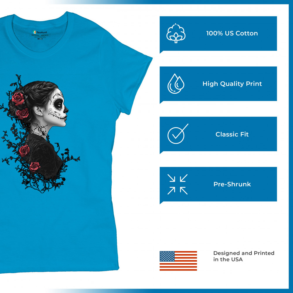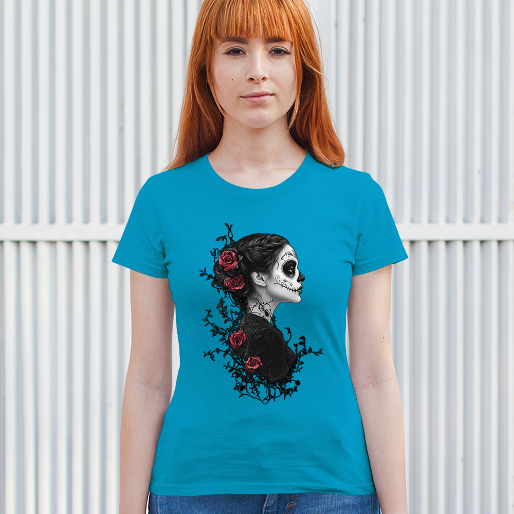 Celebrate Dia de los Muertos in style with this refined sugar skull woman design. Featuring a side profile view, vibrant red roses, and dark gothic floral elements, it creates a graceful balance between mystery and beauty. Ideal for fans of macabre art, skull themes, and honoring ancestral traditions through elegant visuals.