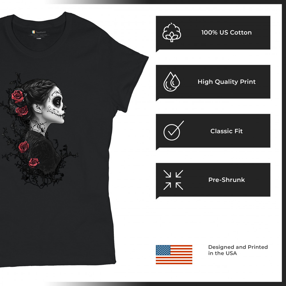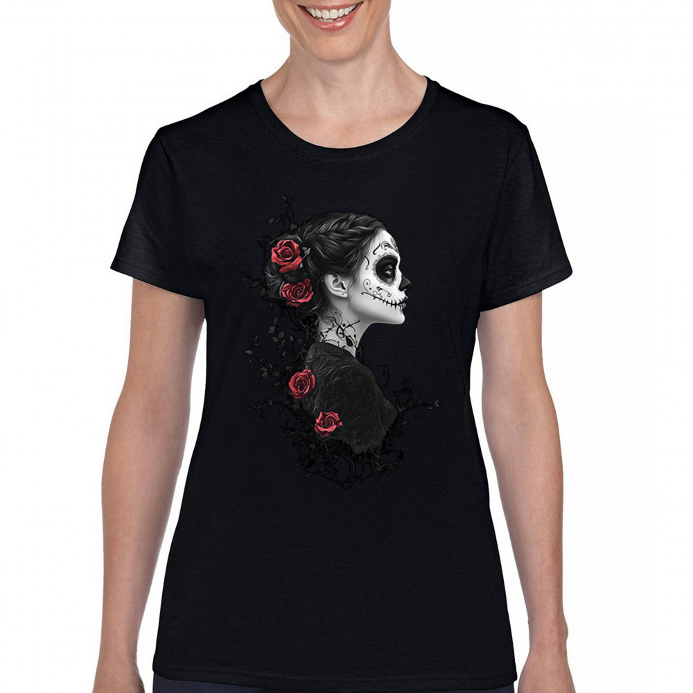 GOTHIC SUGAR SKULL ROSES t-shirt day of dead dark elegance skeleton women's tee black