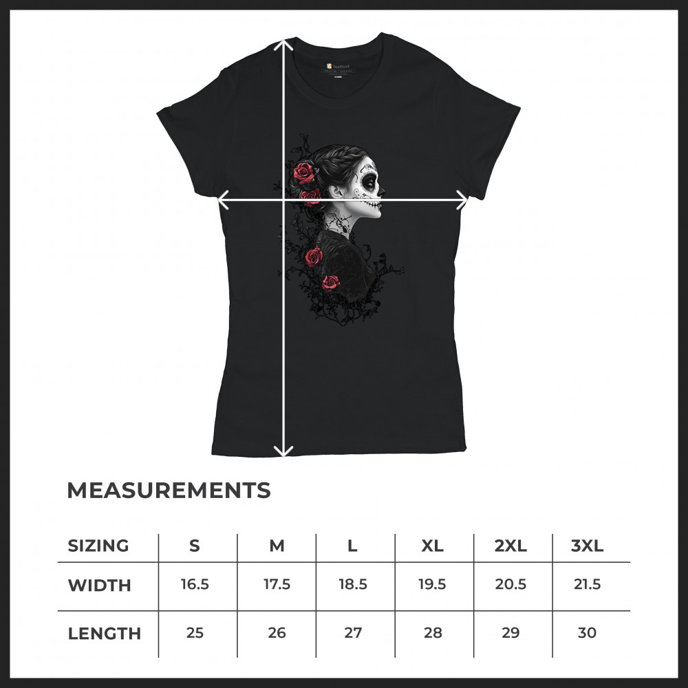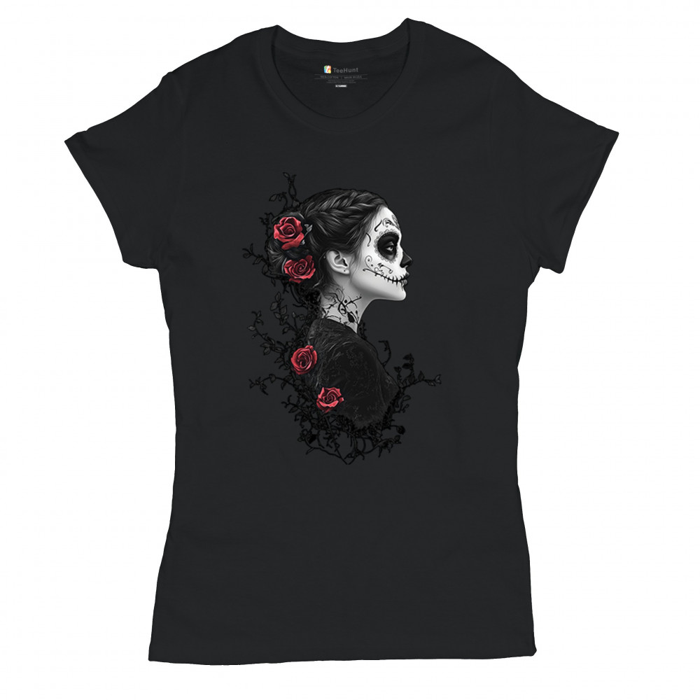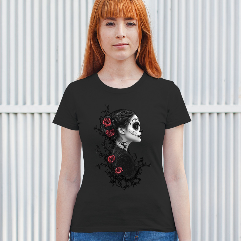 Celebrate Dia de los Muertos in style with this refined sugar skull woman design. Featuring a side profile view, vibrant red roses, and dark gothic floral elements, it creates a graceful balance between mystery and beauty. Ideal for fans of macabre art, skull themes, and honoring ancestral traditions through elegant visuals.