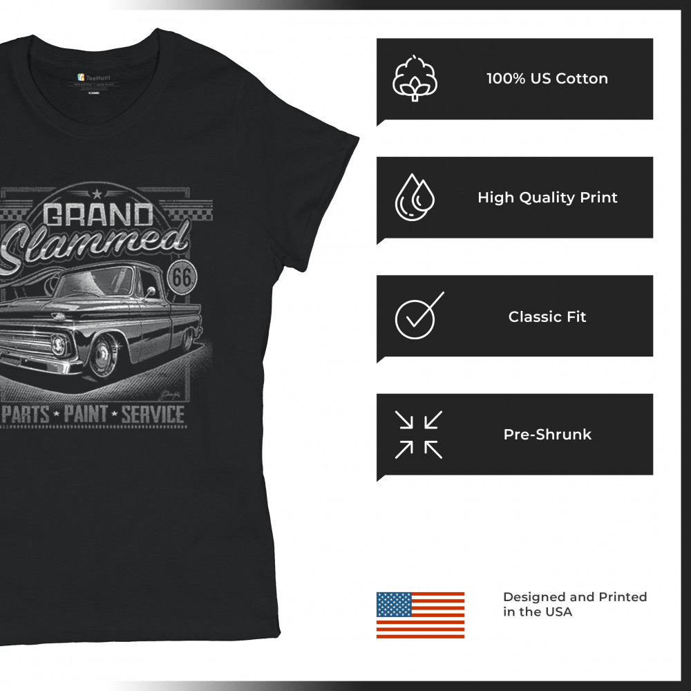 Step back in time with our Grand Slammed vintage truck design, perfect for fans of classic American automotive culture. This shirt showcases a beautifully detailed illustration of a custom truck, making it a standout piece for any car enthusiast. Whether you're attending a car show, hanging out in the garage, or just enjoying a casual day out, this shirt will keep you comfortable and stylish. It's an excellent gift for truck lovers, hot rod aficionados, and anyone with a love for vintage cars. Crafted from premium materials, this shirt offers both durability and softness. Add this unique design to your collection and celebrate the golden era of custom trucks.