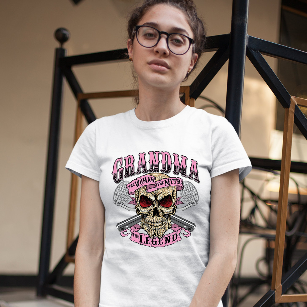 A funny print featuring a skull with two potato mashers behind it. The print says: "Grandma the Woman the Myth the Legend". A great choice as a gift on Mother's Day for a loving caring grandmother.