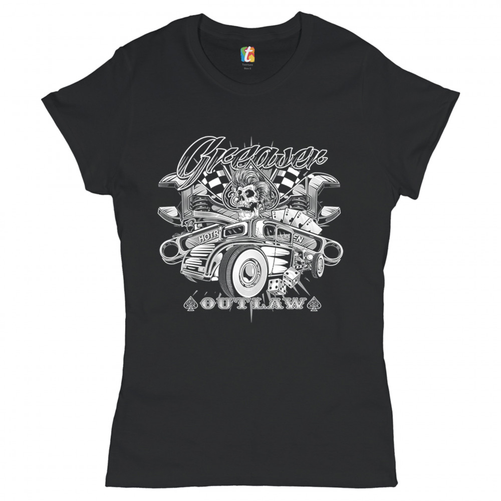 A print featuring a skull, a vintage Hot Rod and a pair of dice. In the background there are crossed wrenches, playing cards and racing flags. The print says: "Greaser outlaw". A great choice for a fan of customized American classic cars and hot rods.