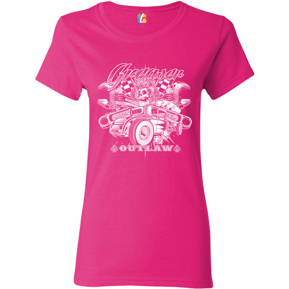 A print featuring a skull, a vintage Hot Rod and a pair of dice. In the background there are crossed wrenches, playing cards and racing flags. The print says: "Greaser outlaw". A great choice for a fan of customized American classic cars and hot rods.