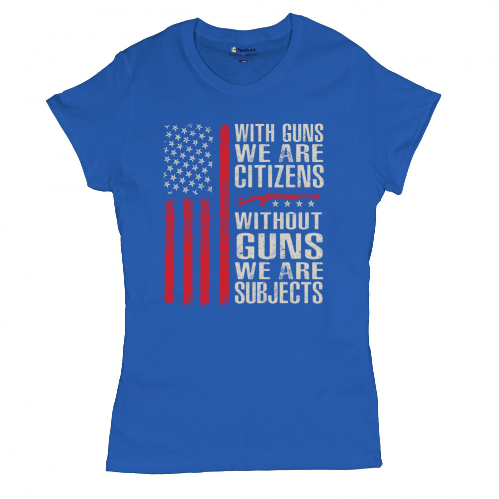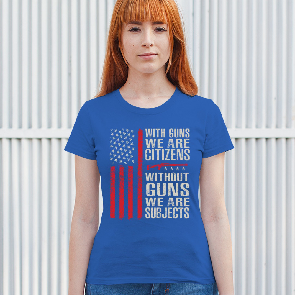 Make your voice heard with this powerful pro-2A design featuring an AR-15 graphic and distressed red American flag. The quote “With Guns We Are Citizens, Without Guns We Are Subjects†speaks directly to the heart of liberty and personal defense. A must-have for patriots, protestors, and gun rights supporters who defend the Constitution.