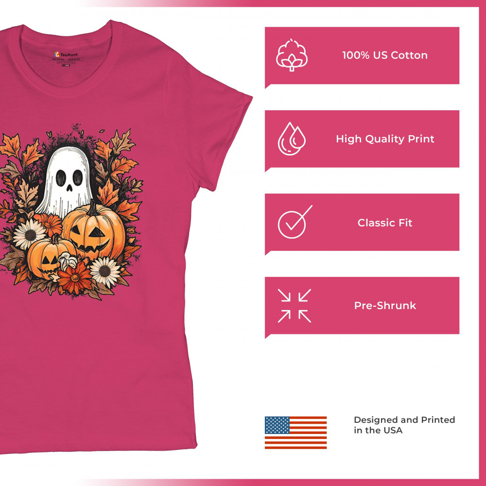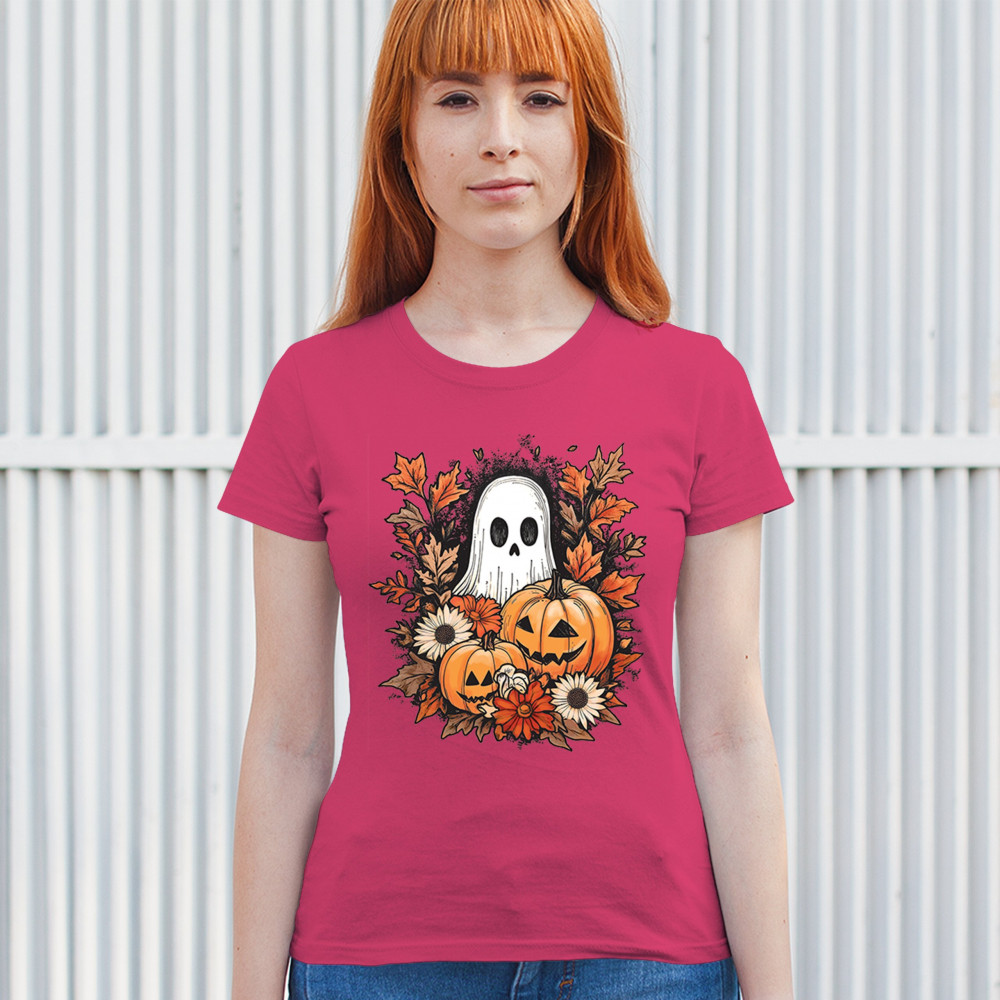 Celebrate the arrival of fall with this delightful design featuring pumpkins, autumn leaves, flowers, and a cute ghost. It's the perfect addition to your Halloween and autumn-themed wardrobe, or even as decor to welcome the fall spirit into your home. The combination of spooky and cozy elements creates a festive yet warm vibe, ideal for Halloween parties, pumpkin patch trips, or just enjoying the beautiful fall season.
