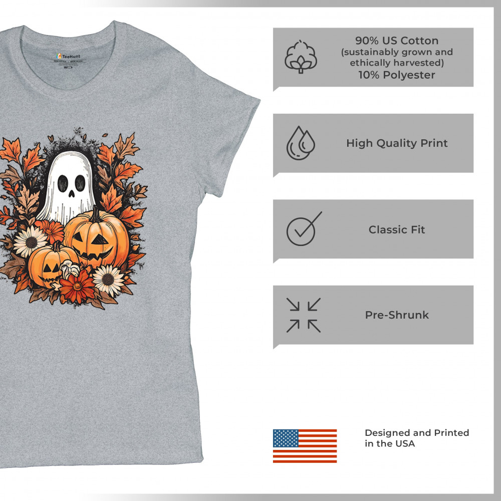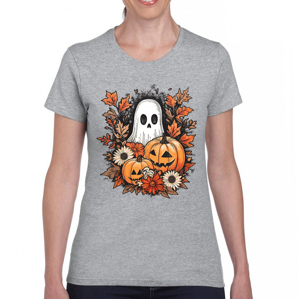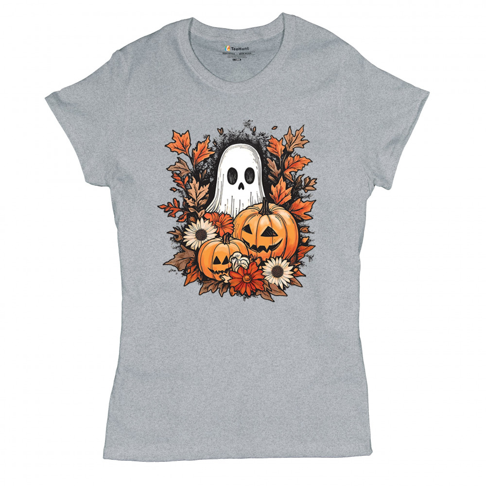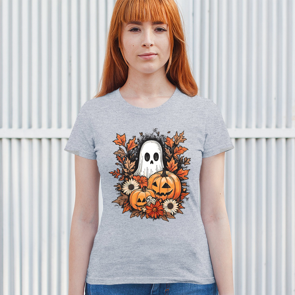 Celebrate the arrival of fall with this delightful design featuring pumpkins, autumn leaves, flowers, and a cute ghost. It's the perfect addition to your Halloween and autumn-themed wardrobe, or even as decor to welcome the fall spirit into your home. The combination of spooky and cozy elements creates a festive yet warm vibe, ideal for Halloween parties, pumpkin patch trips, or just enjoying the beautiful fall season.