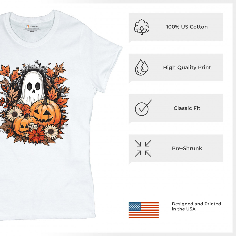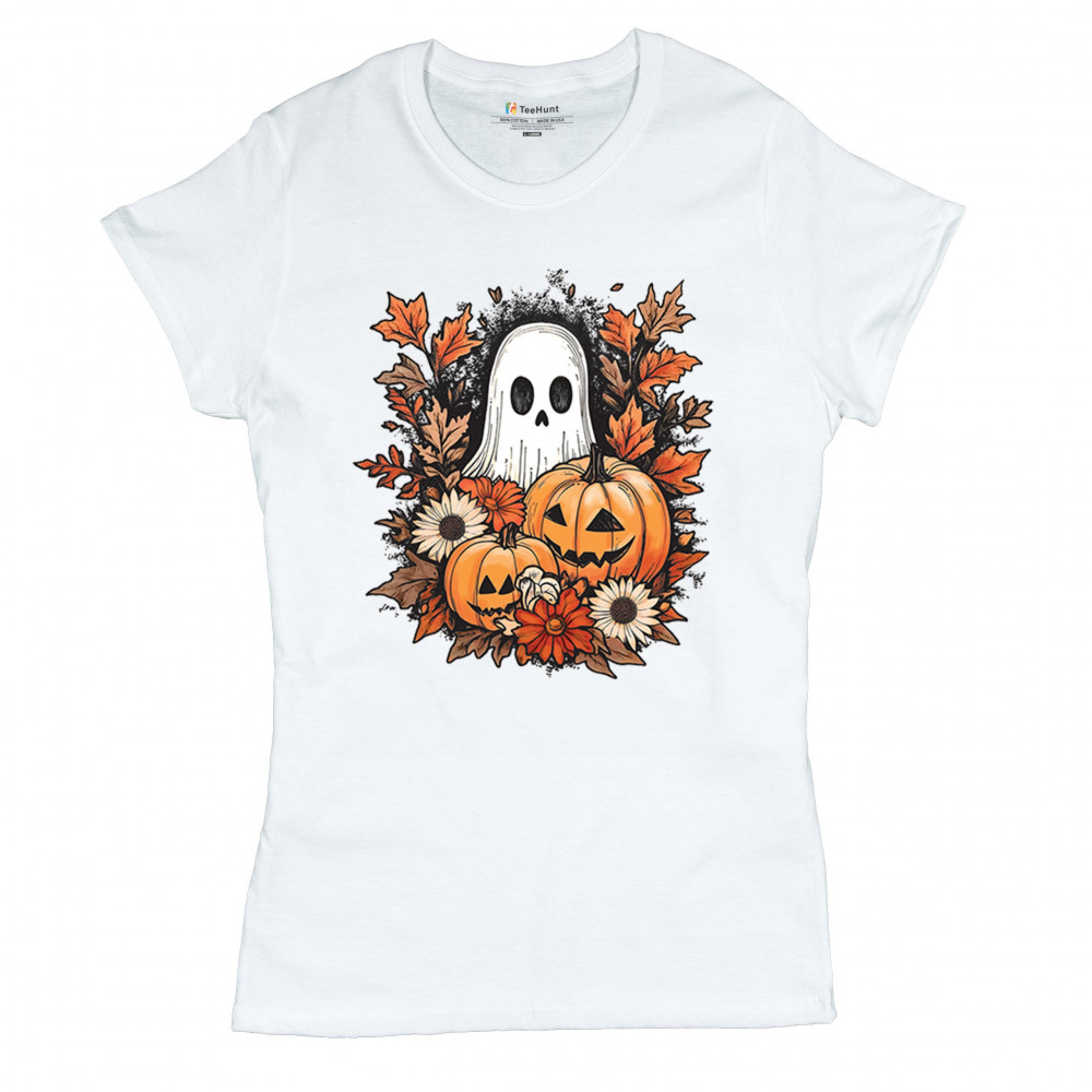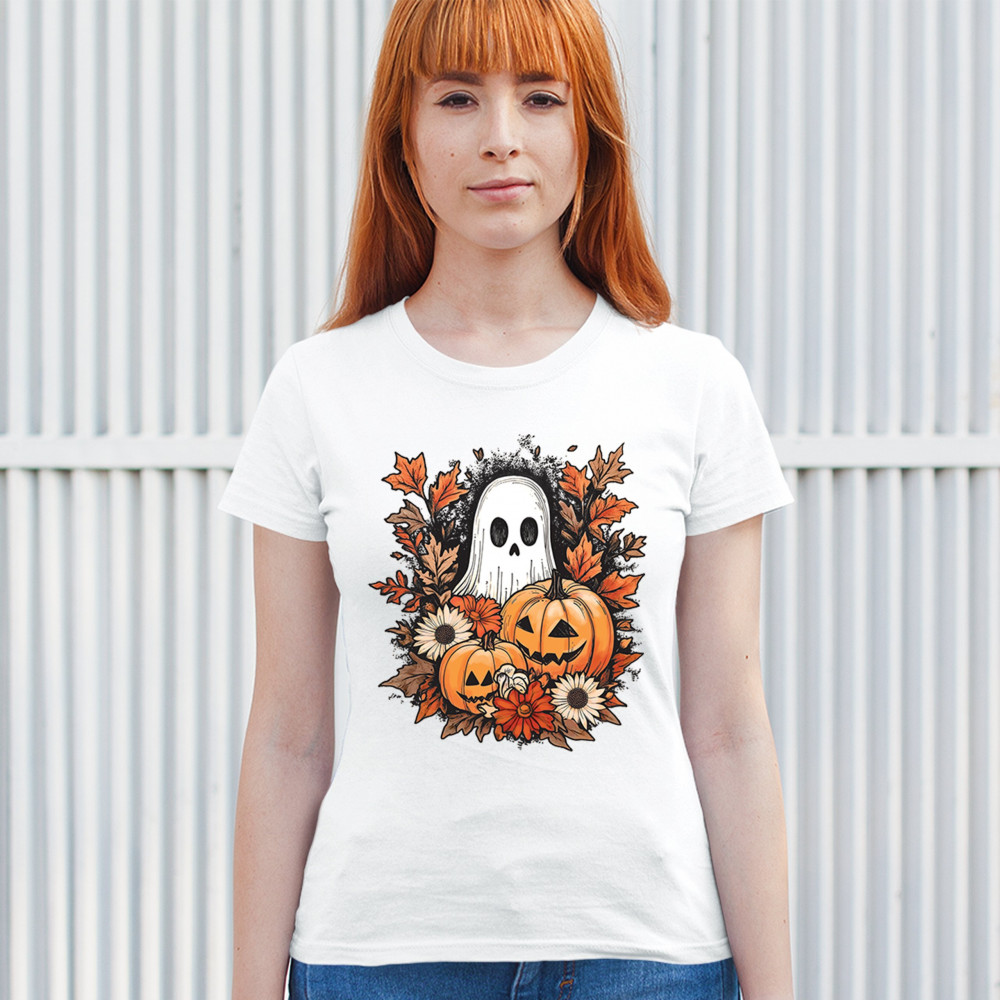 Celebrate the arrival of fall with this delightful design featuring pumpkins, autumn leaves, flowers, and a cute ghost. It's the perfect addition to your Halloween and autumn-themed wardrobe, or even as decor to welcome the fall spirit into your home. The combination of spooky and cozy elements creates a festive yet warm vibe, ideal for Halloween parties, pumpkin patch trips, or just enjoying the beautiful fall season.