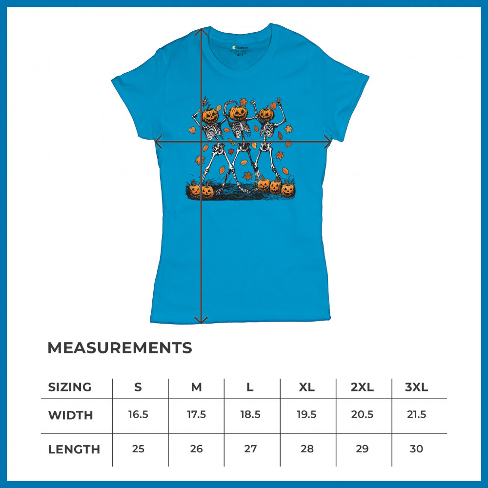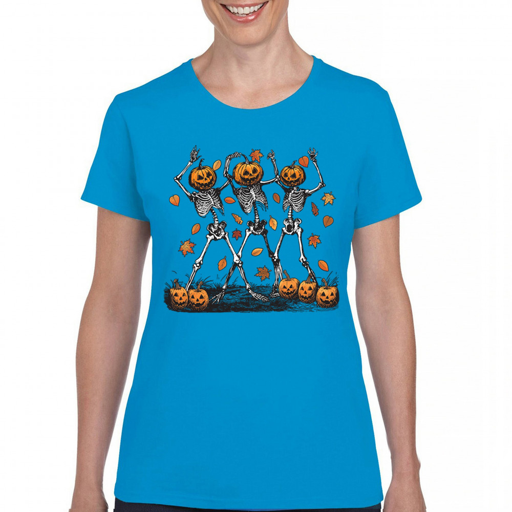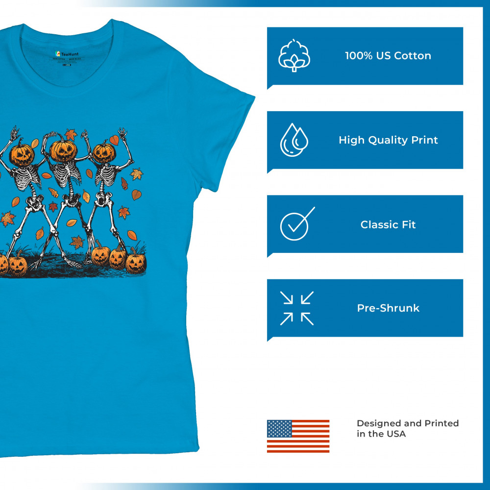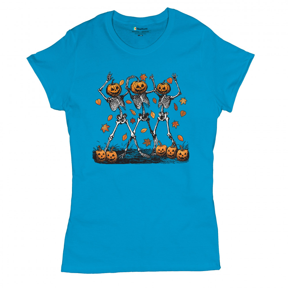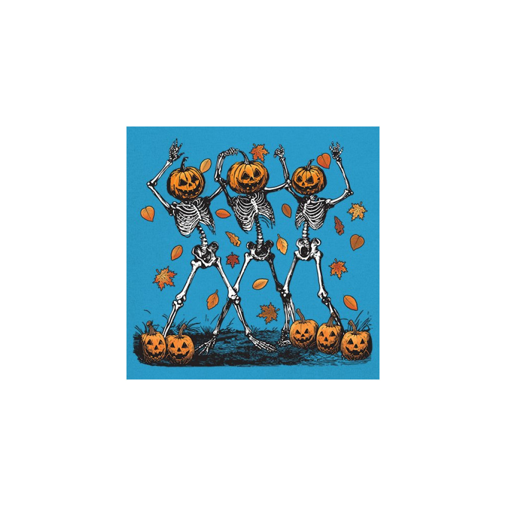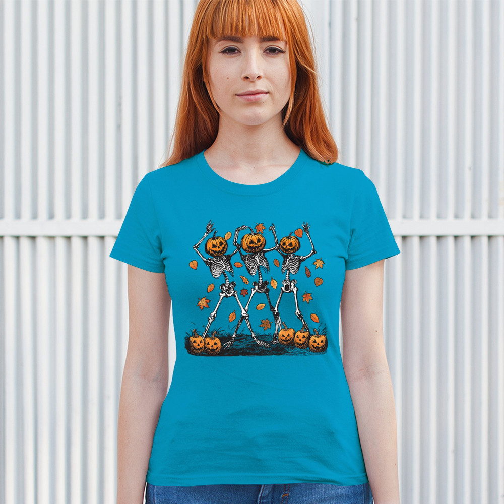 Add a touch of spooky fun to your wardrobe with this lively design featuring pumpkin-headed skeletons dancing through a swirl of autumn leaves. Perfect for Halloween parties, trick-or-treating, and fall festivals, this design is a must-have for anyone who enjoys the whimsical side of the spooky season. Made with comfort and quality in mind, this is the perfect apparel for all your October gatherings and events. Wear it to show off your Halloween spirit!