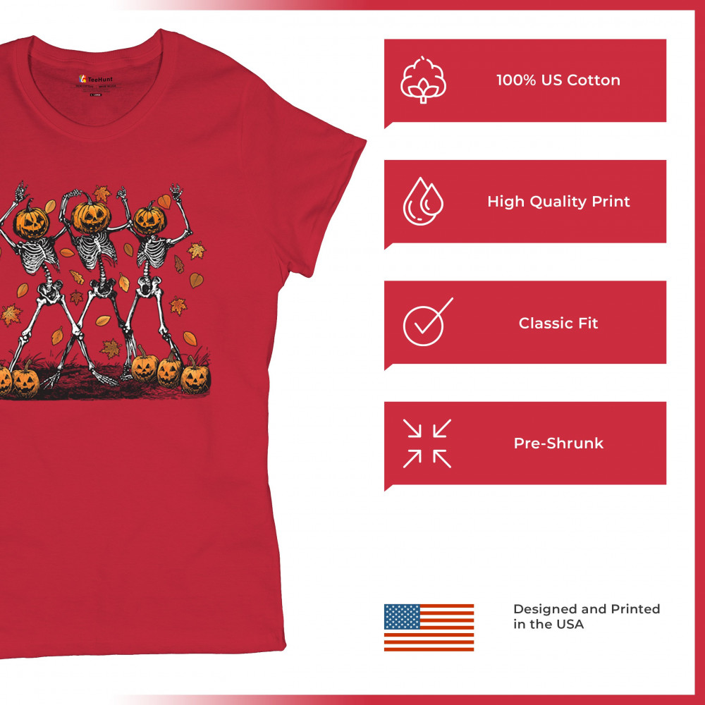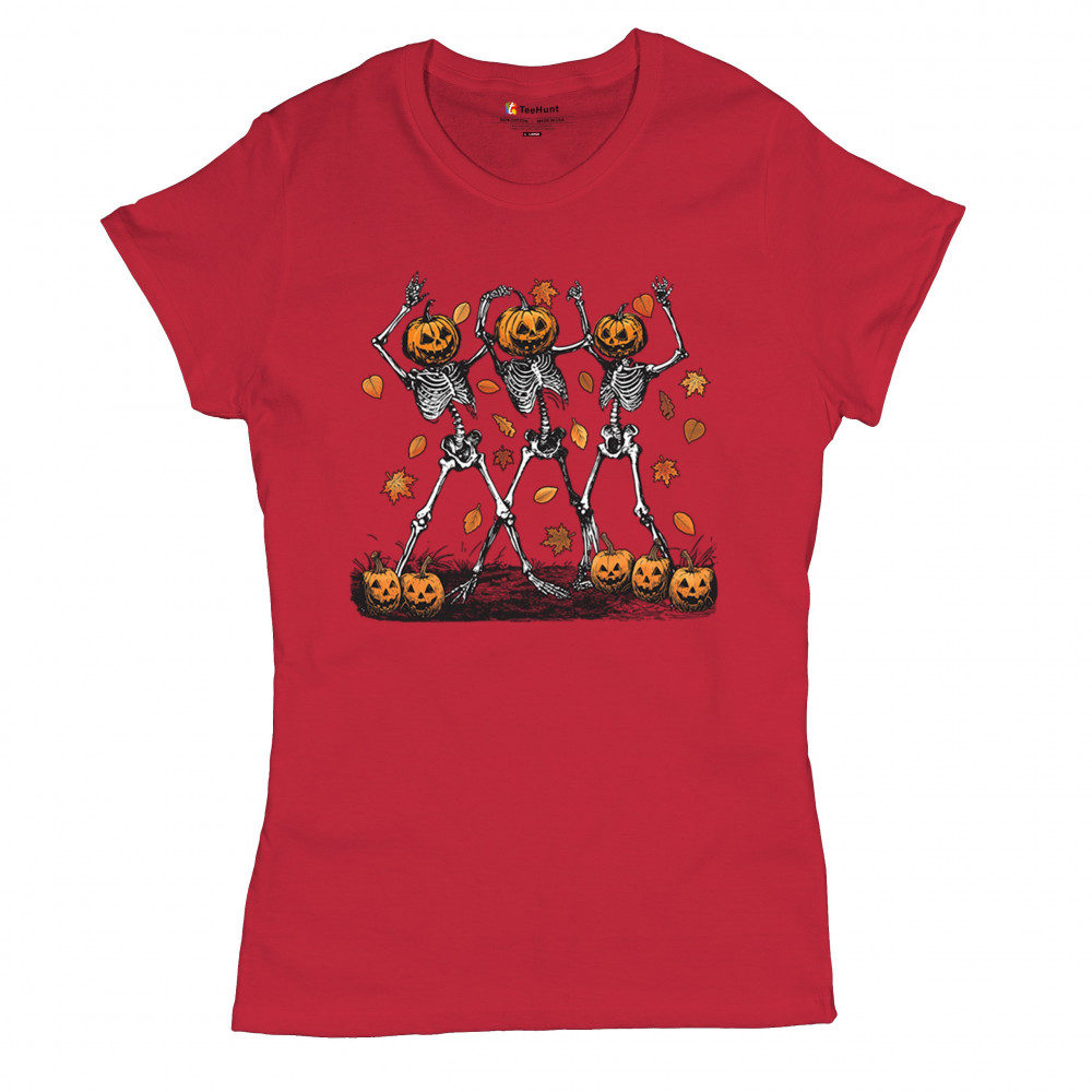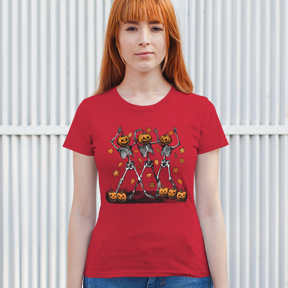 Add a touch of spooky fun to your wardrobe with this lively design featuring pumpkin-headed skeletons dancing through a swirl of autumn leaves. Perfect for Halloween parties, trick-or-treating, and fall festivals, this design is a must-have for anyone who enjoys the whimsical side of the spooky season. Made with comfort and quality in mind, this is the perfect apparel for all your October gatherings and events. Wear it to show off your Halloween spirit!