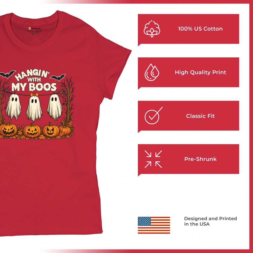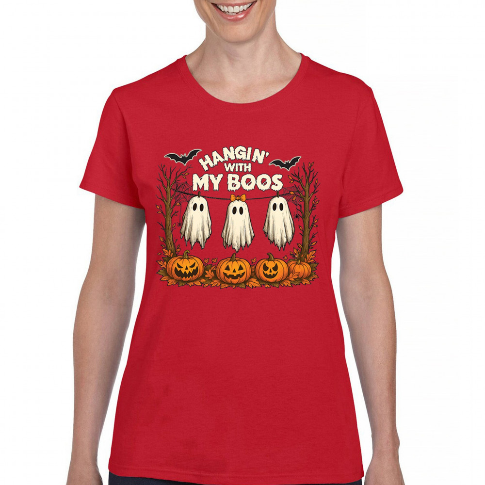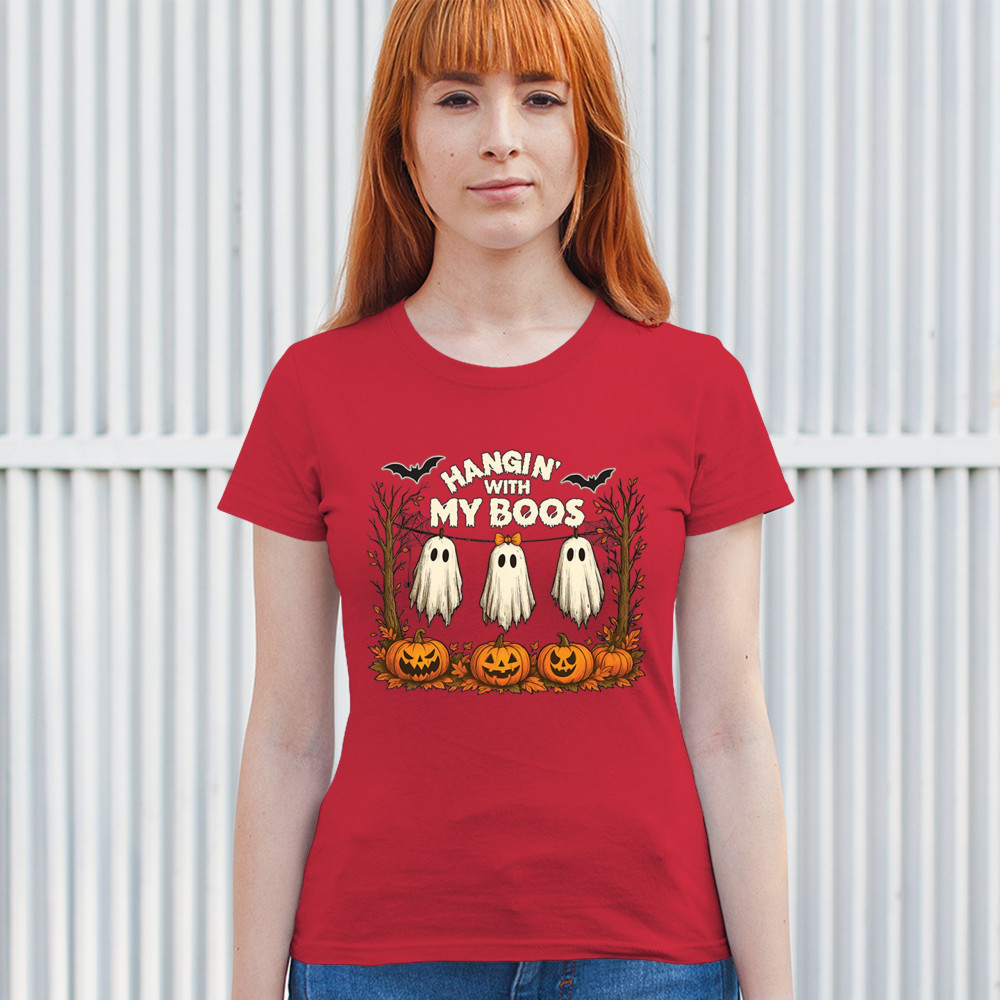 Hangin With My Boos design featuring spooky ghosts, jack o lanterns, and haunted house humor. Perfect for Halloween night, October 31, and parties.