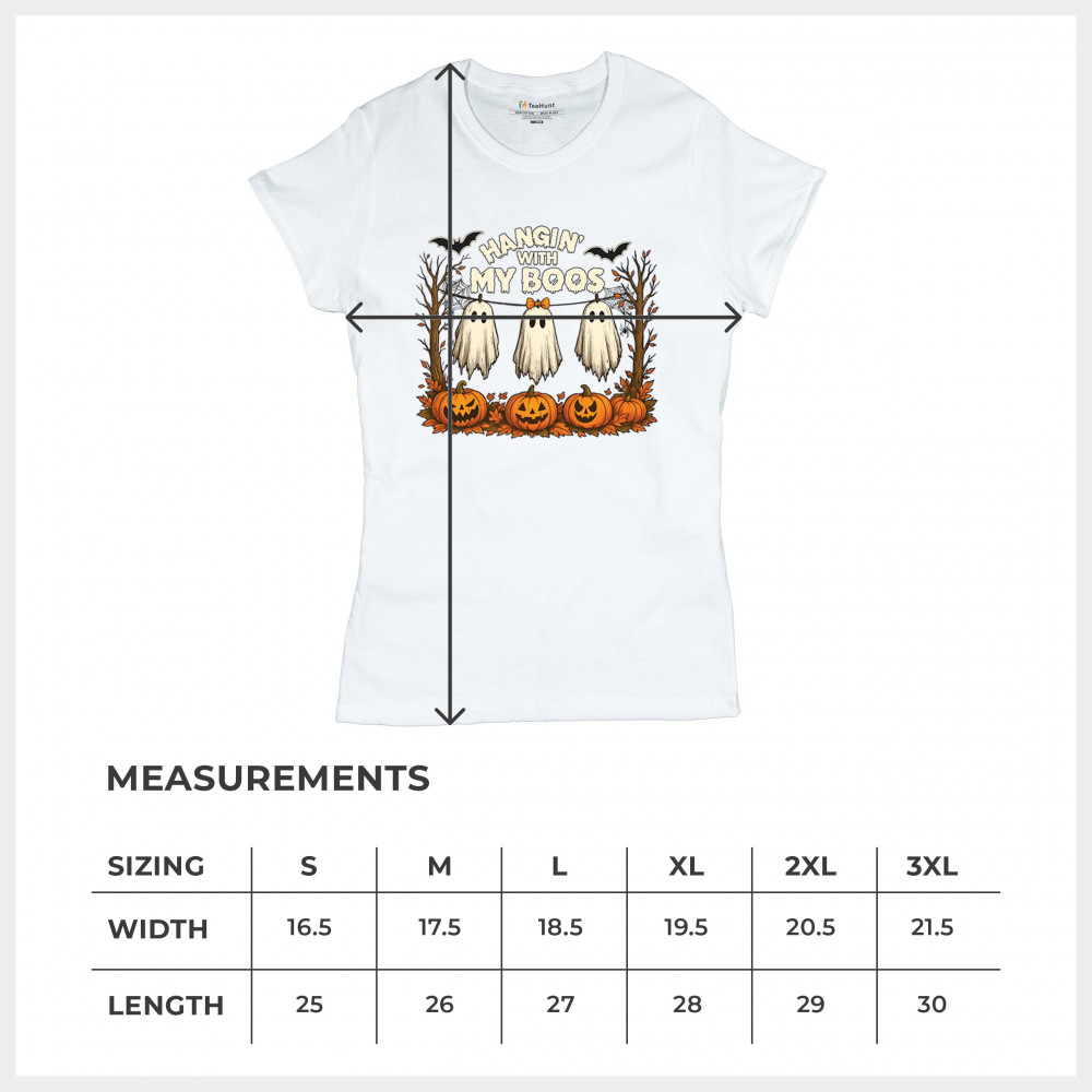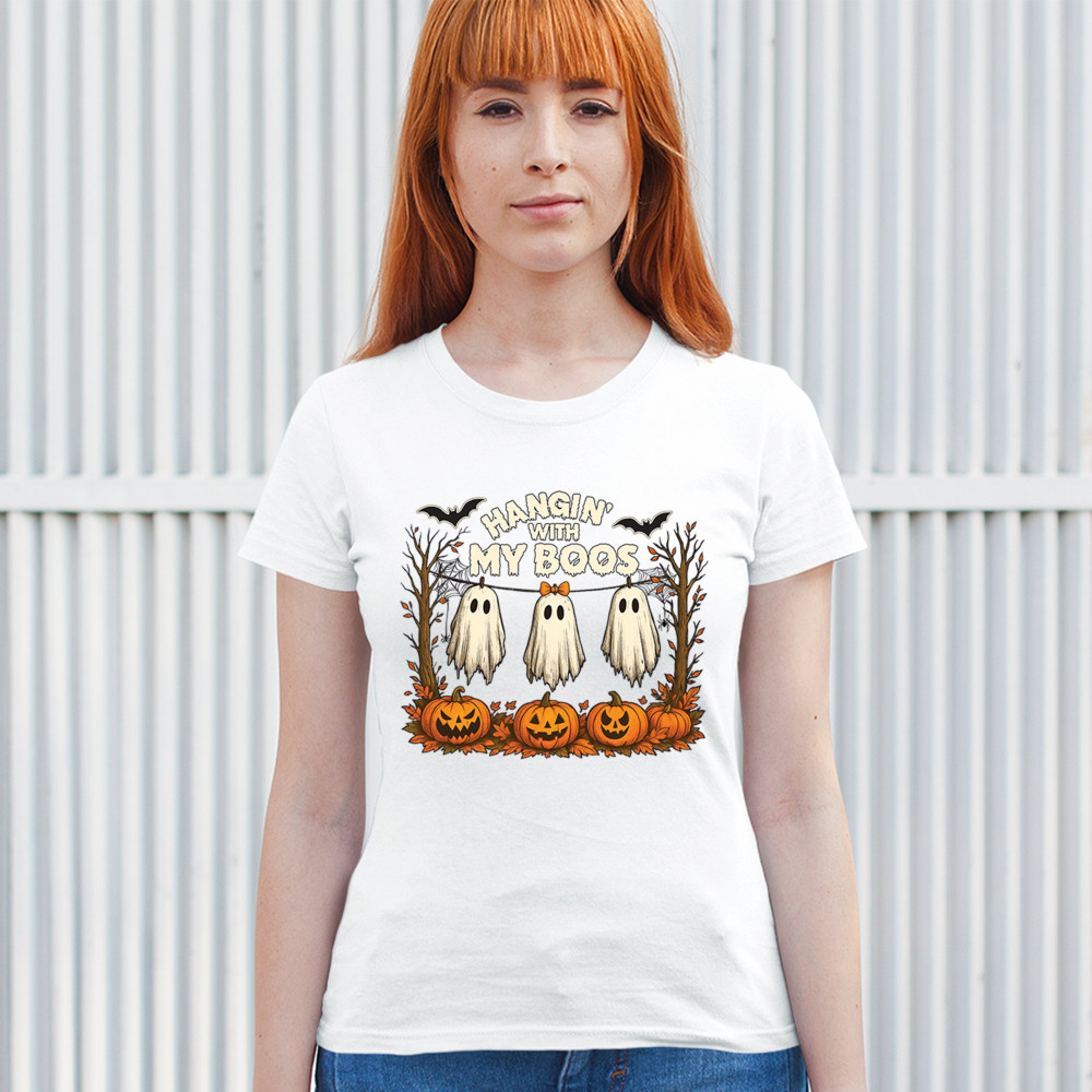 Hangin With My Boos design featuring spooky ghosts, jack o lanterns, and haunted house humor. Perfect for Halloween night, October 31, and parties.