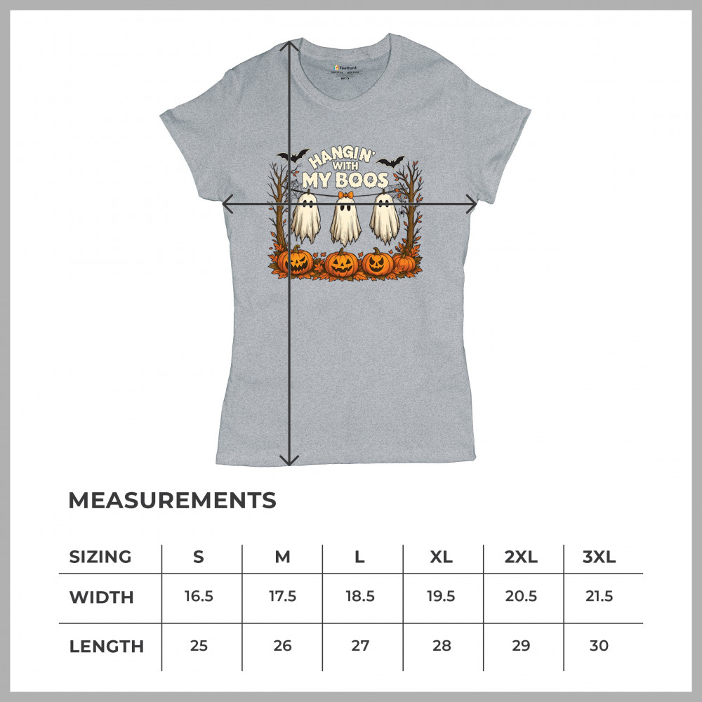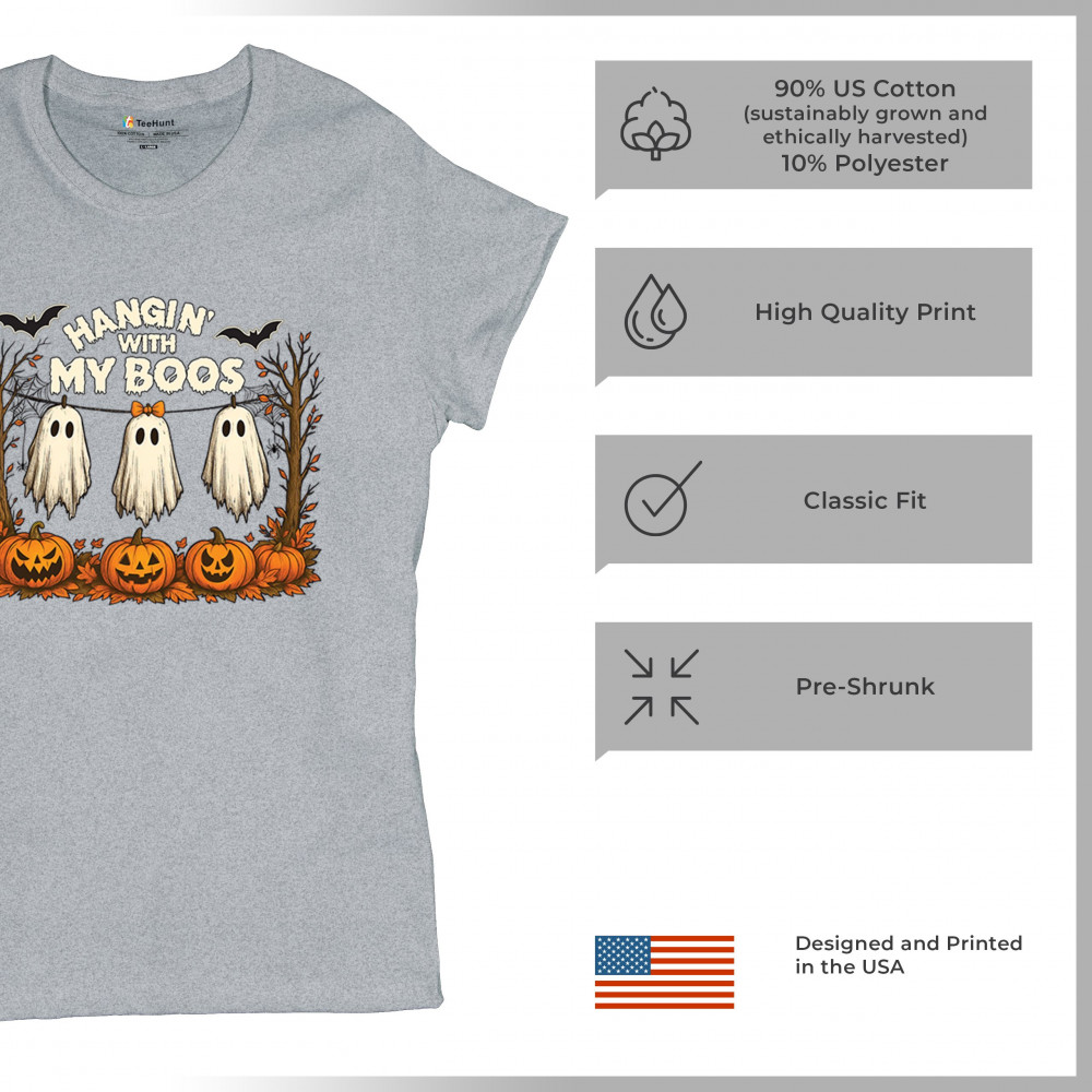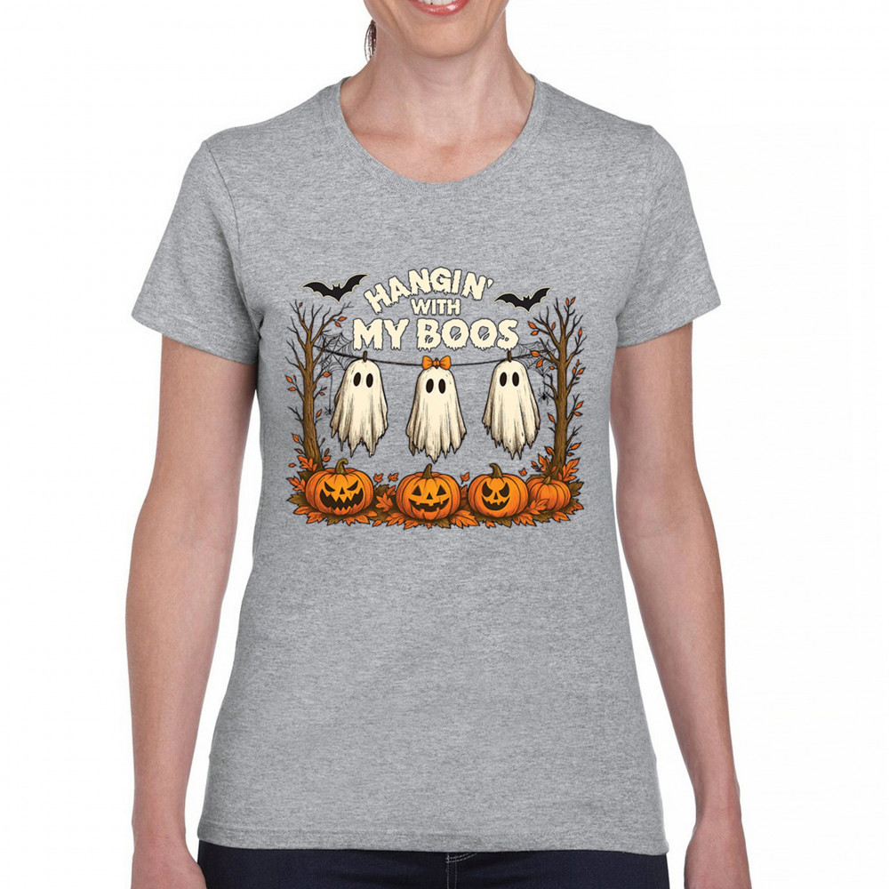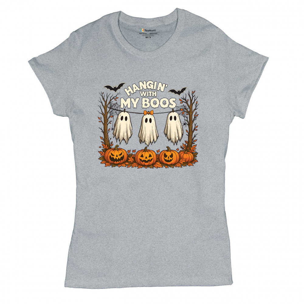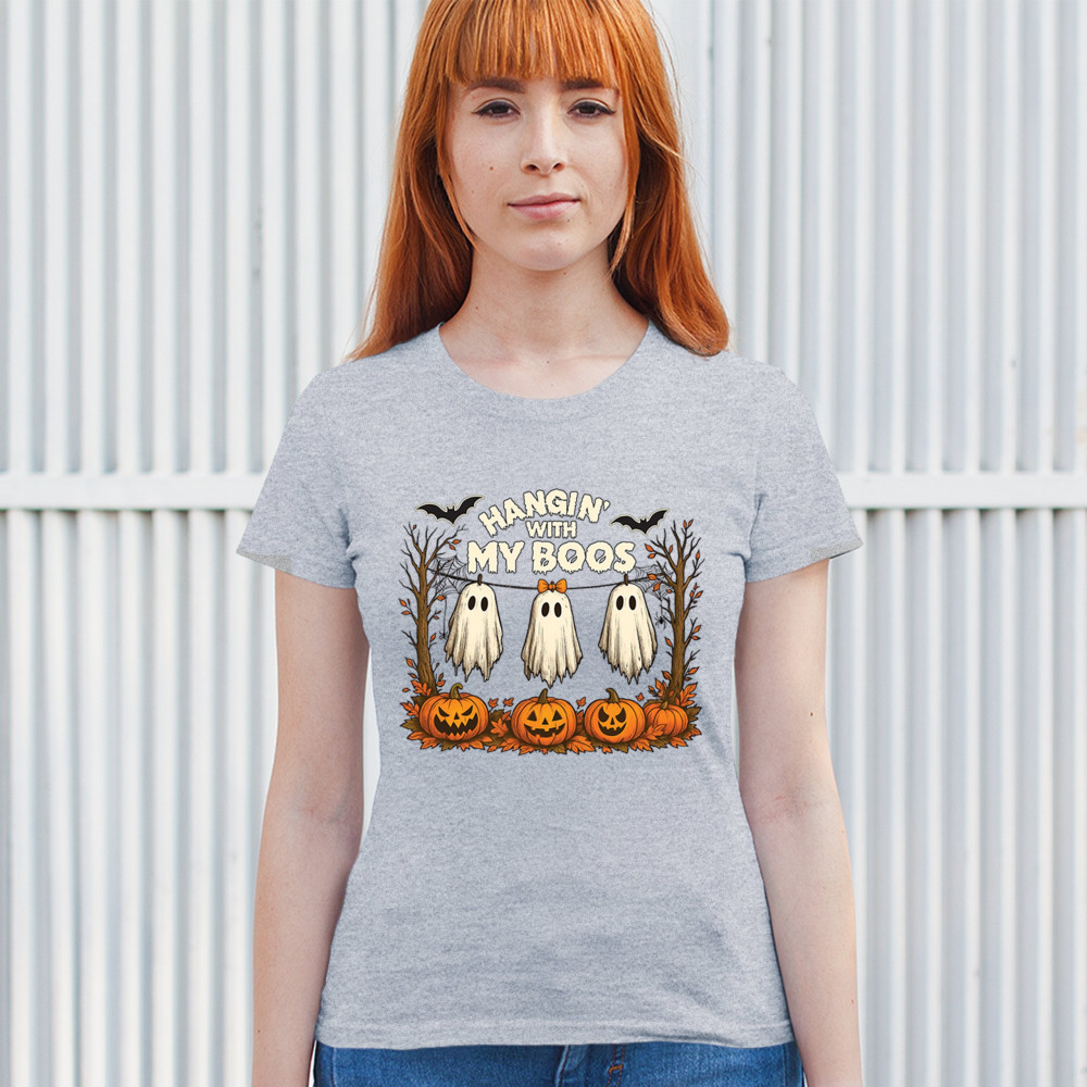 Hangin With My Boos design featuring spooky ghosts, jack o lanterns, and haunted house humor. Perfect for Halloween night, October 31, and parties.