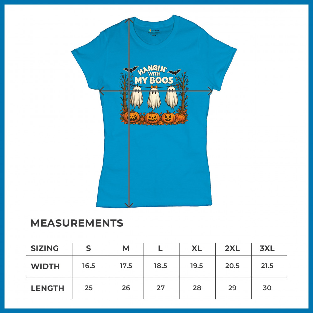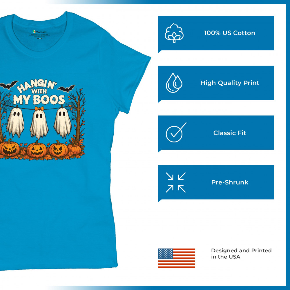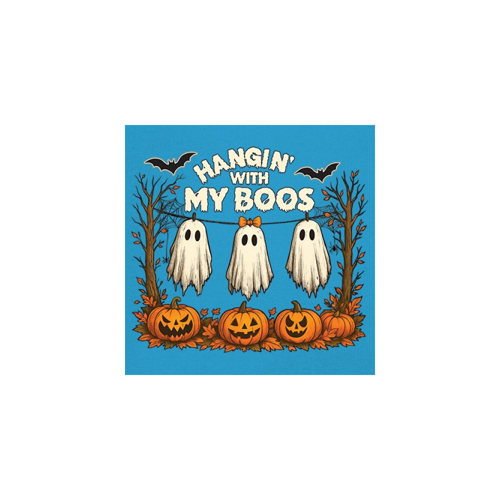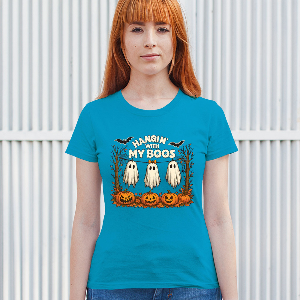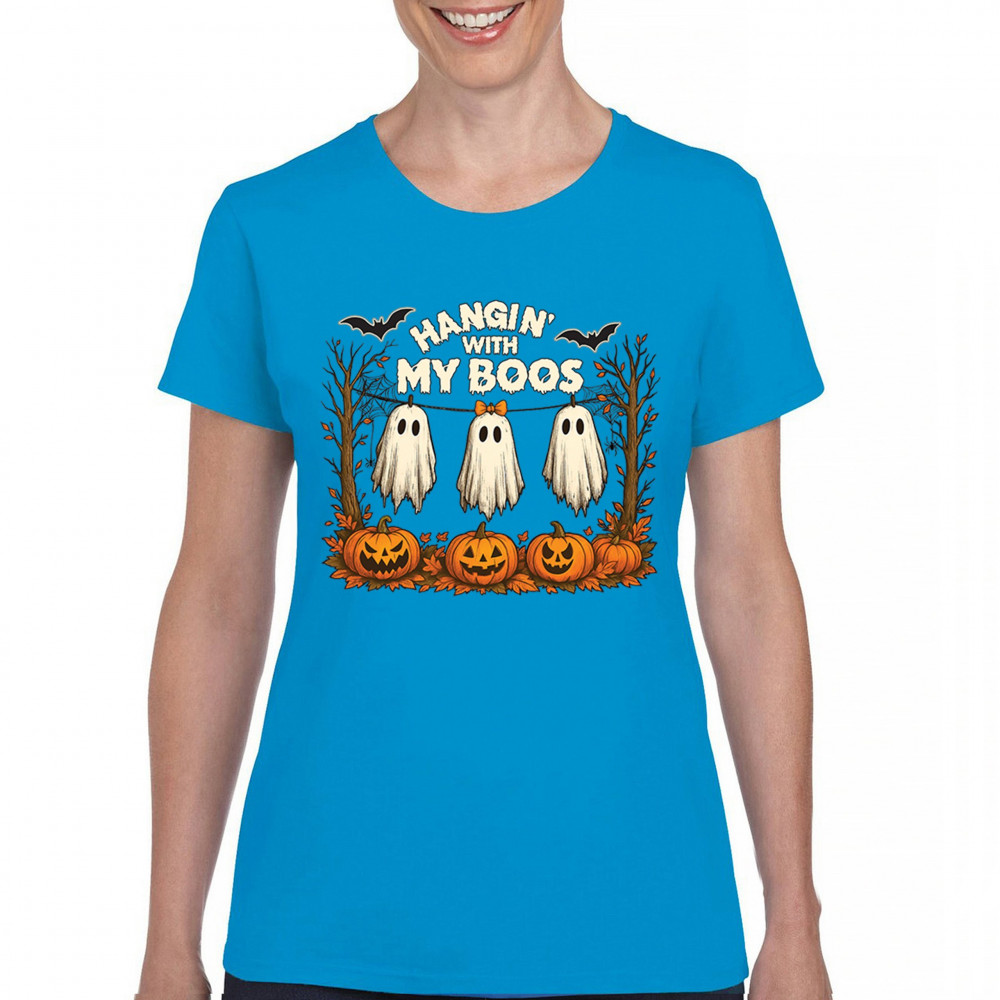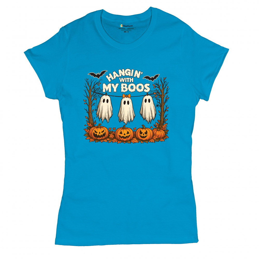 Hangin With My Boos design featuring spooky ghosts, jack o lanterns, and haunted house humor. Perfect for Halloween night, October 31, and parties.