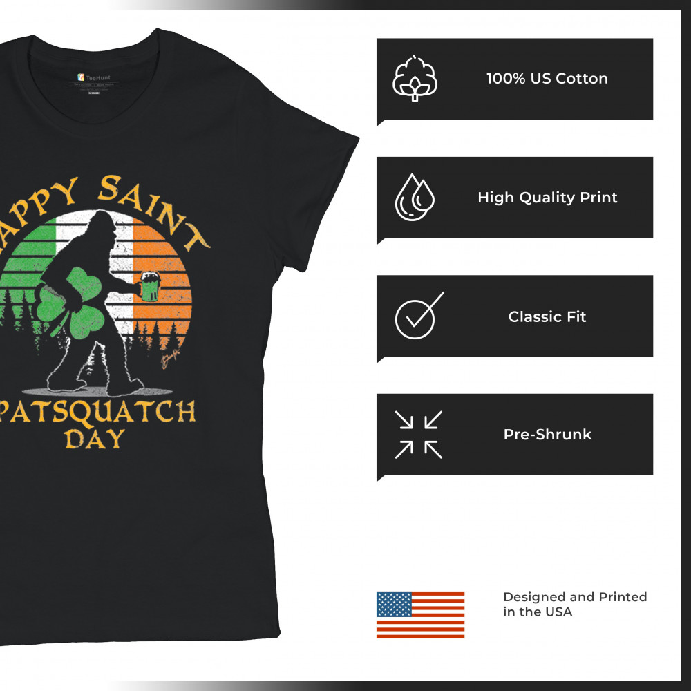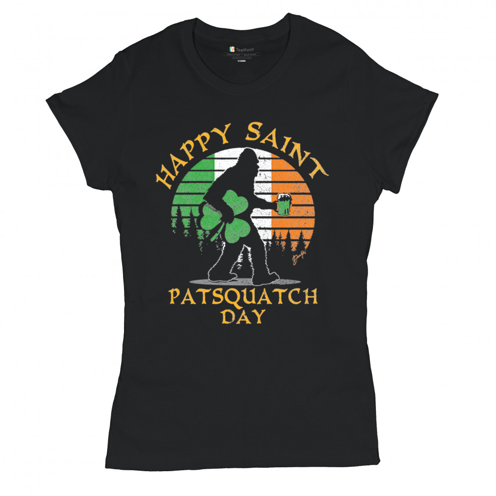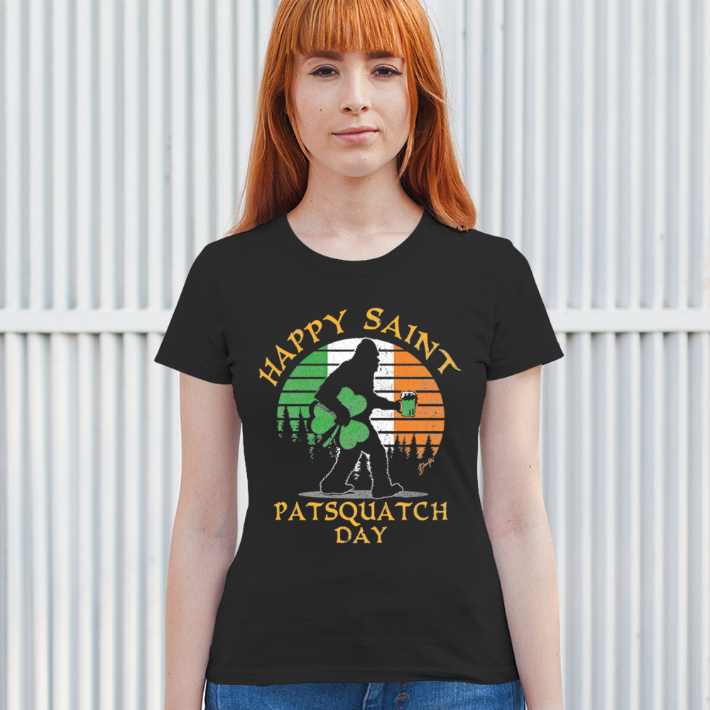 HAPPY SAINT PATSQUATCH DAY t-shirt st. patrick's big foot shamrock women's tee black