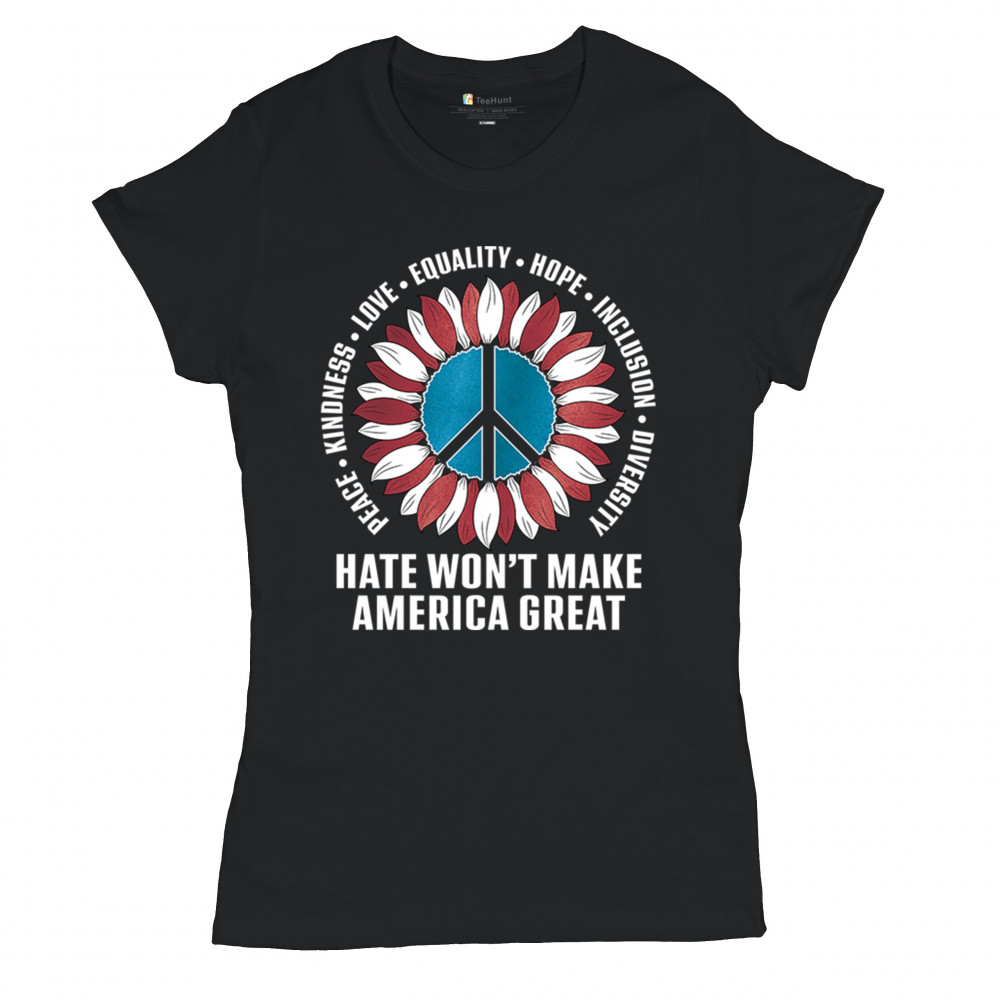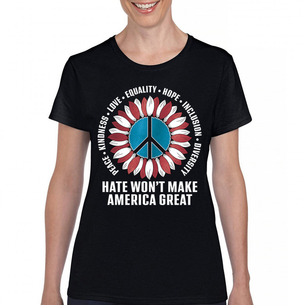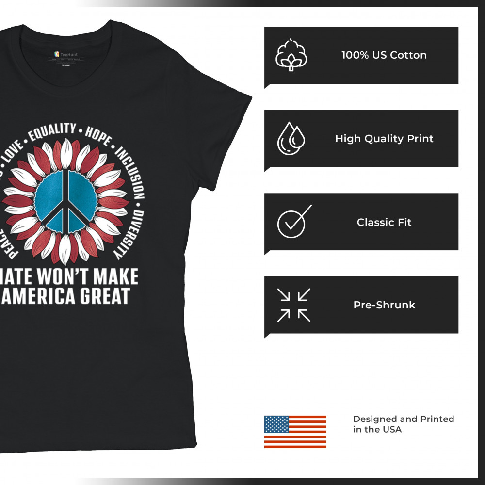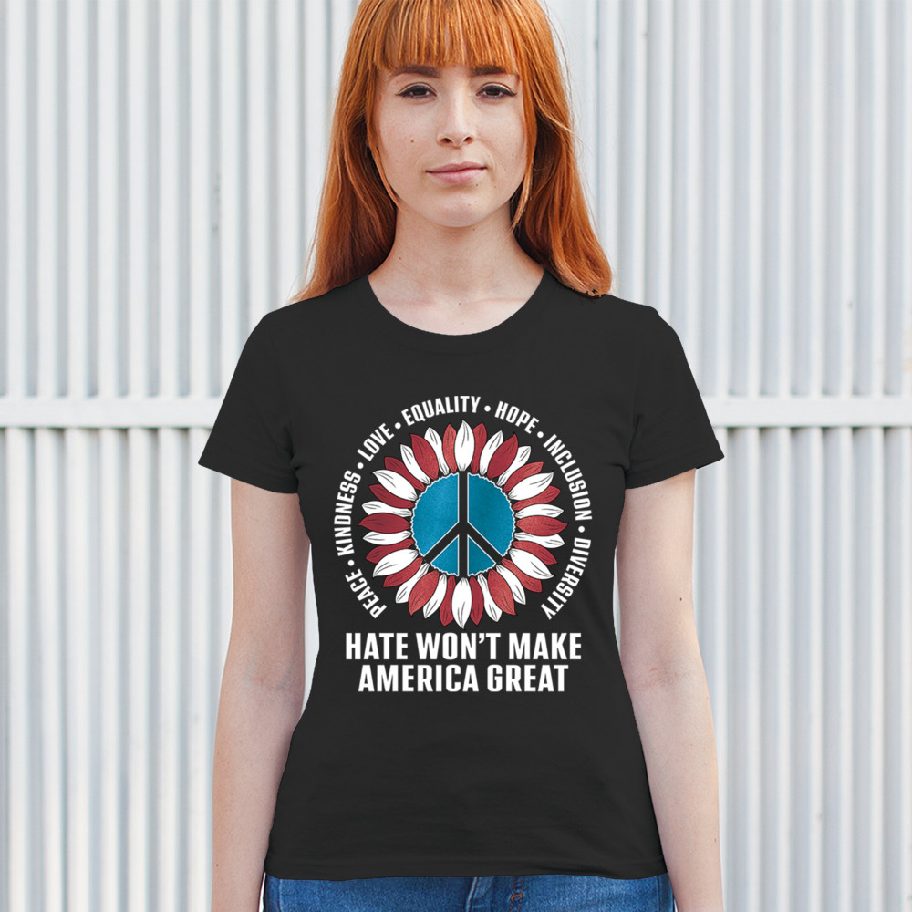 Embrace the message of love, equality, and unity with this eye-catching design. The sunflower and peace symbol represent a commitment to kindness and inclusion, rejecting hate and division. Perfect for those who support liberal values, this design is a bold statement against negativity and for a brighter future. Wear it proudly to show your belief in a diverse, united America. Let this design be a symbol of hope and progress for all.