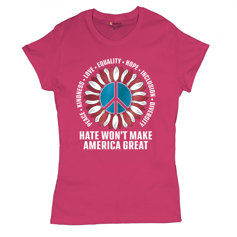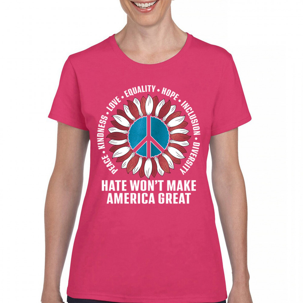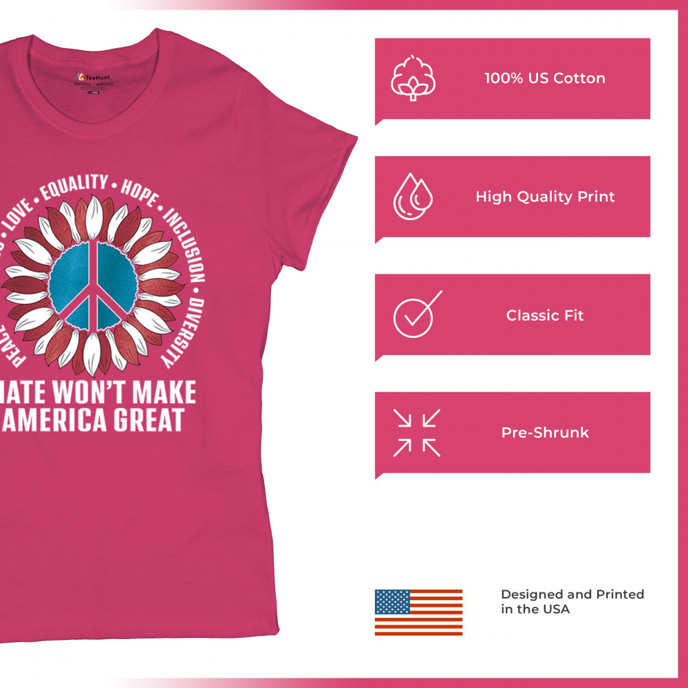 Embrace the message of love, equality, and unity with this eye-catching design. The sunflower and peace symbol represent a commitment to kindness and inclusion, rejecting hate and division. Perfect for those who support liberal values, this design is a bold statement against negativity and for a brighter future. Wear it proudly to show your belief in a diverse, united America. Let this design be a symbol of hope and progress for all.