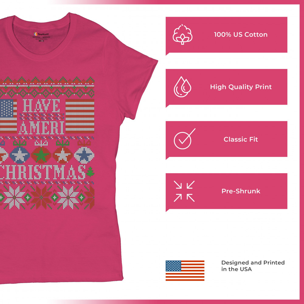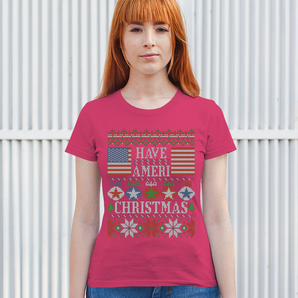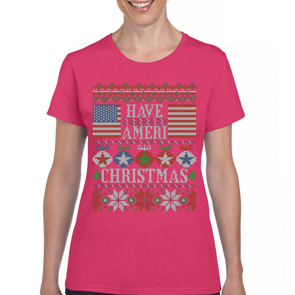 HAVE AMERI CHRISTMAS t-shirt american flag ugly sweater patriotic women's tee pink