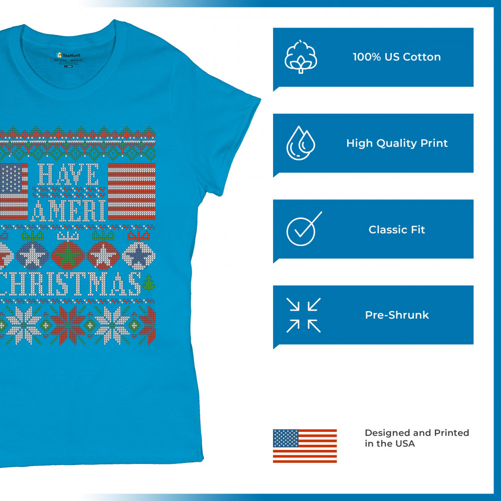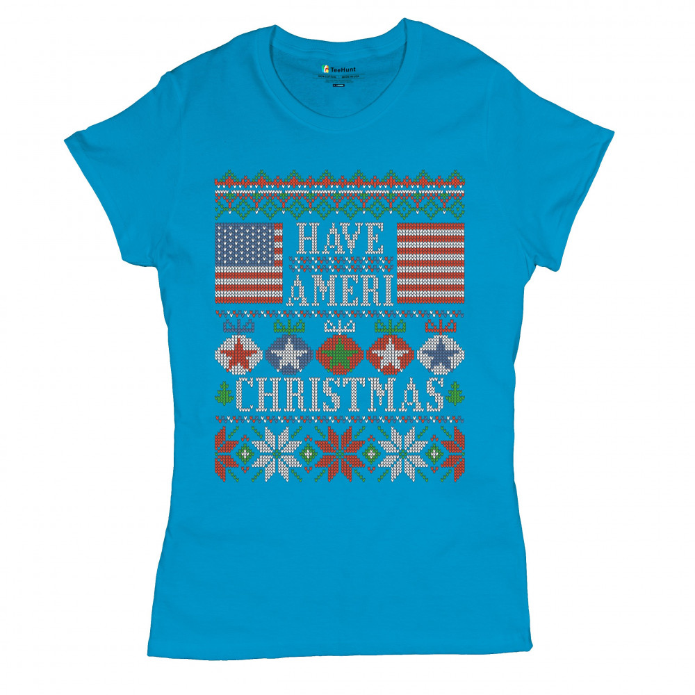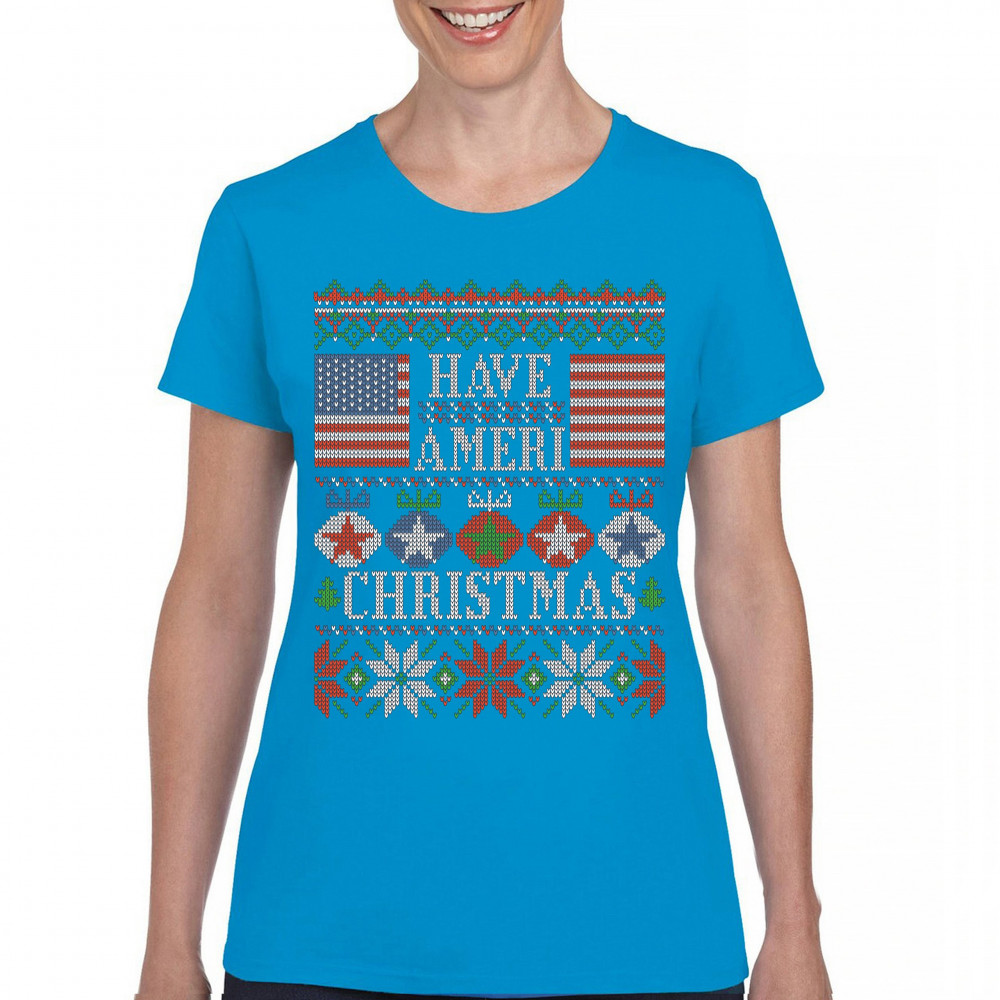 HAVE AMERI CHRISTMAS t-shirt american flag ugly sweater patriotic women's tee light blue