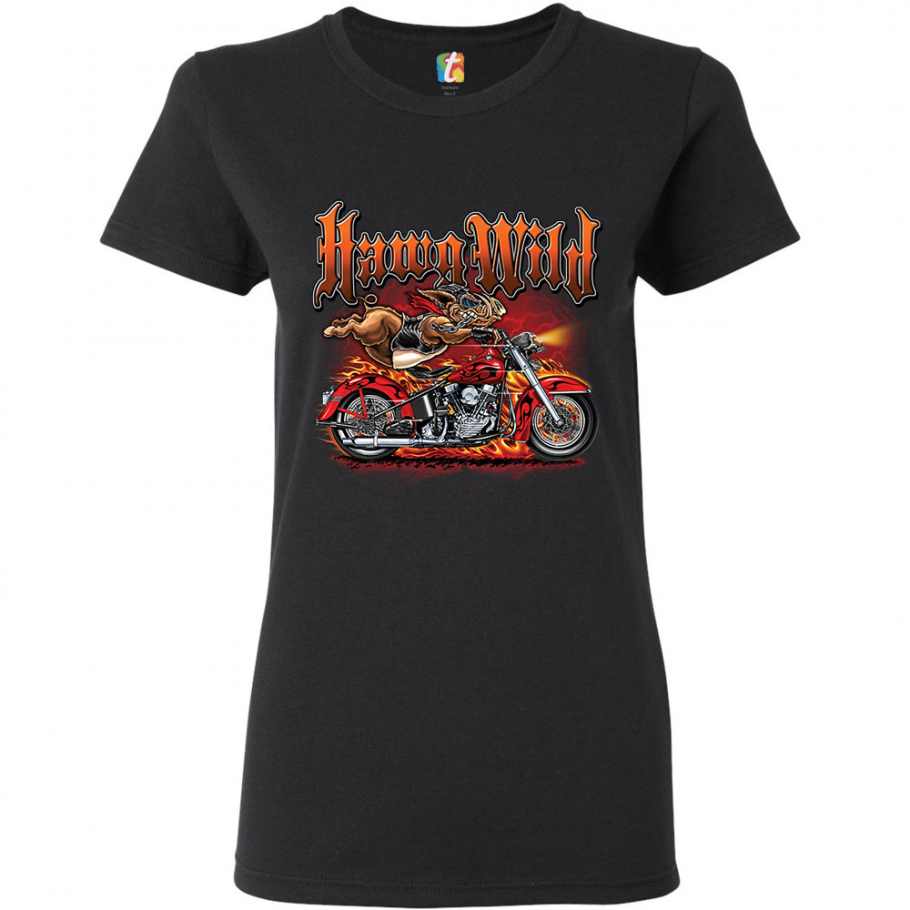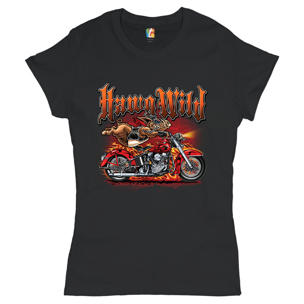 A print featuring a warthog biker holding onto the handlebars of a motorcycle riding so fast, it's body is lifted from the bike. The bike is on fire and there a lightning strikes in the background. The print says: "Hawg Wild". A great choice for a motorcy