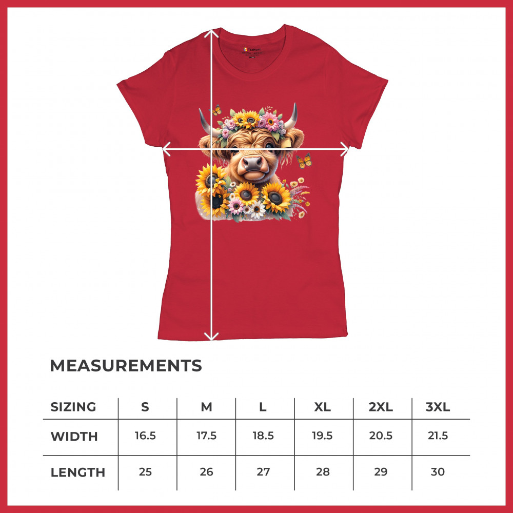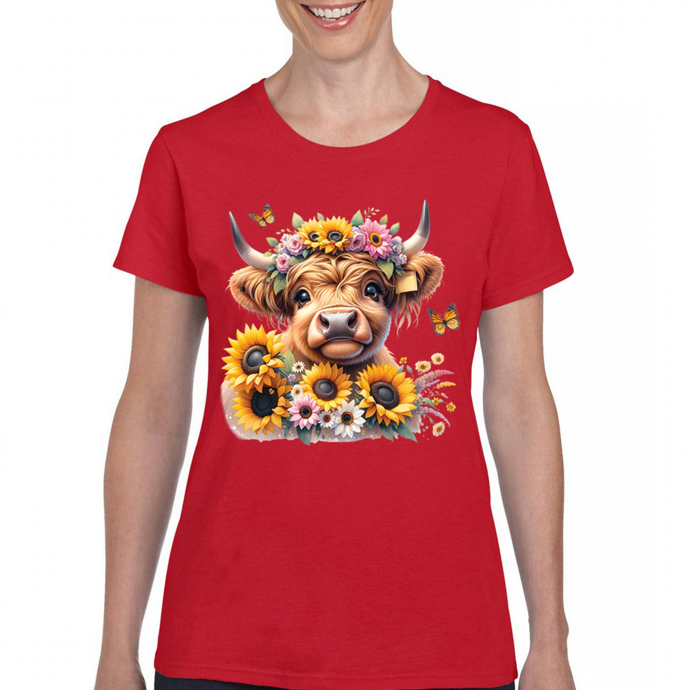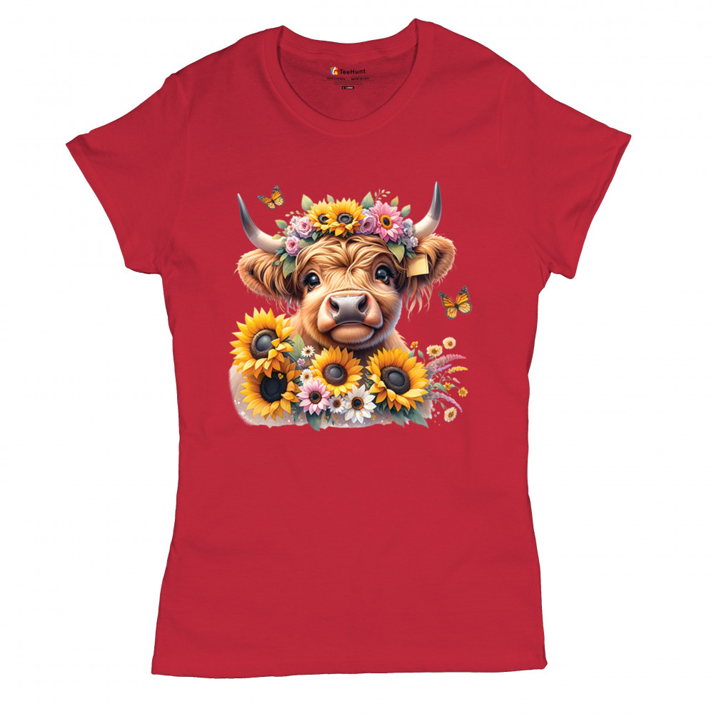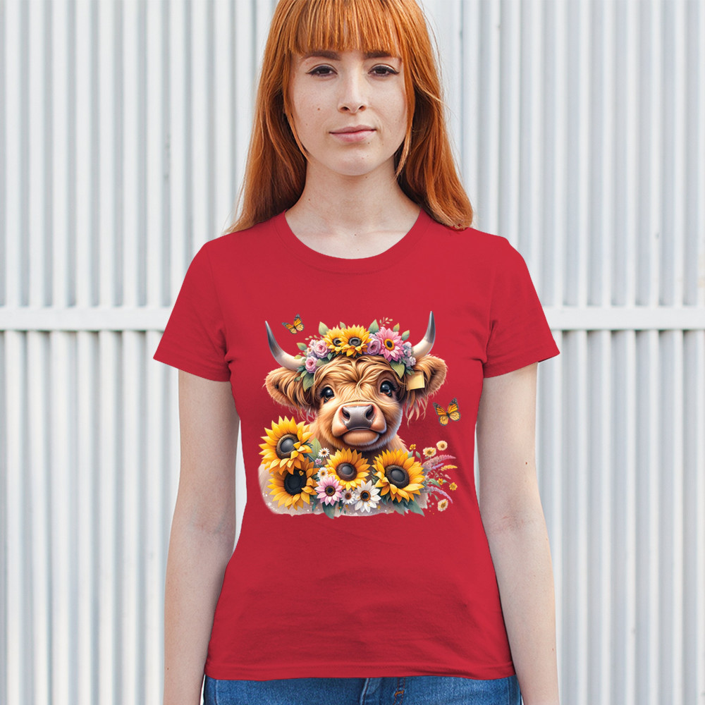 Highland Cow floral design with sunflowers and daisies, rustic farmhouse cow style, western ranch boho charm, and cozy country farmhouse shirt vibes.