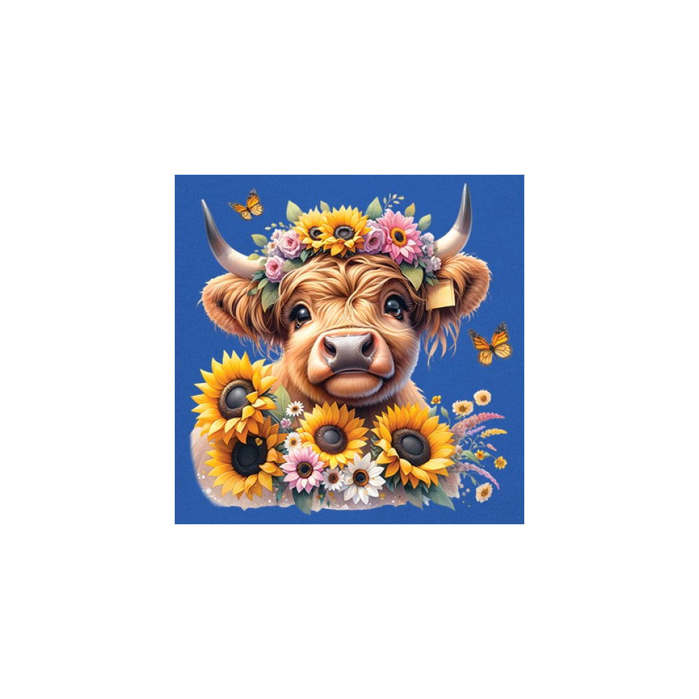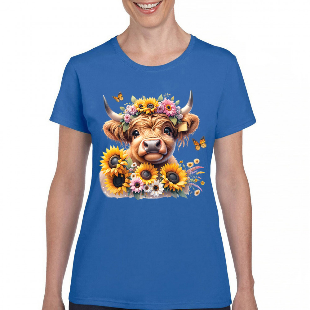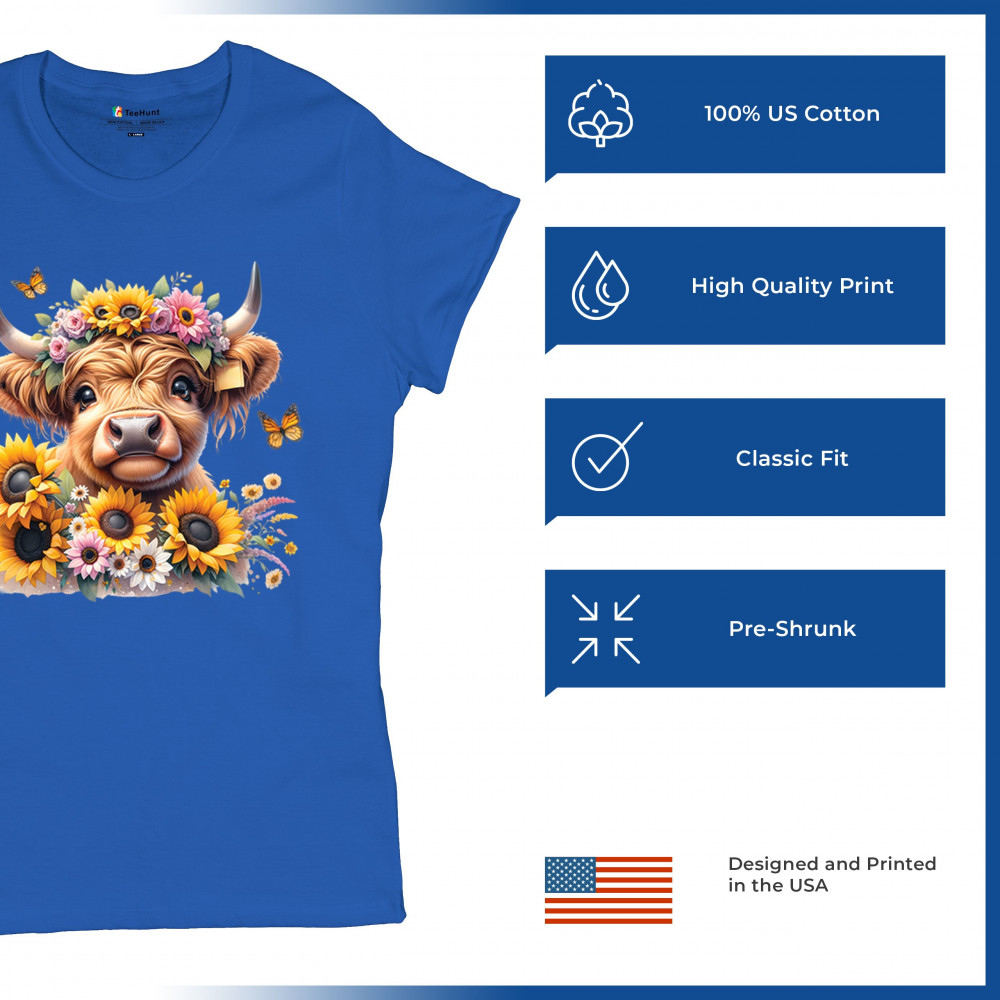 Highland Cow floral design with sunflowers and daisies, rustic farmhouse cow style, western ranch boho charm, and cozy country farmhouse shirt vibes.