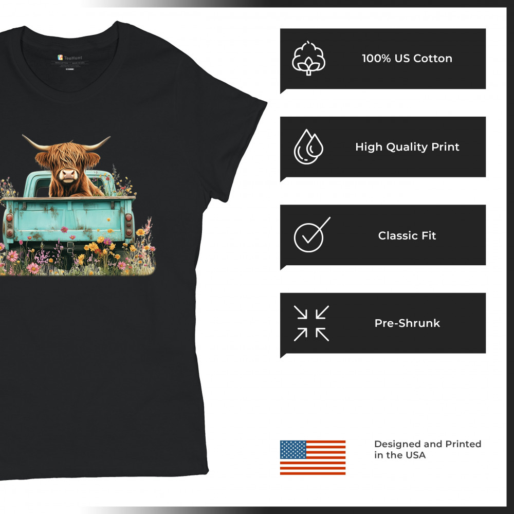 Celebrate rustic charm with this Highland Cow truck design, combining farmhouse floral truck art, boho ranch vibes, and country farmhouse shirt appeal. Perfect for cow lovers, barn style enthusiasts, and small town rural living. A vintage truck cow design that’s both cozy and stylish.