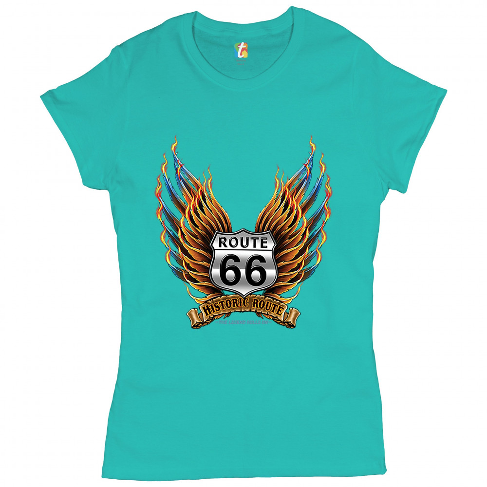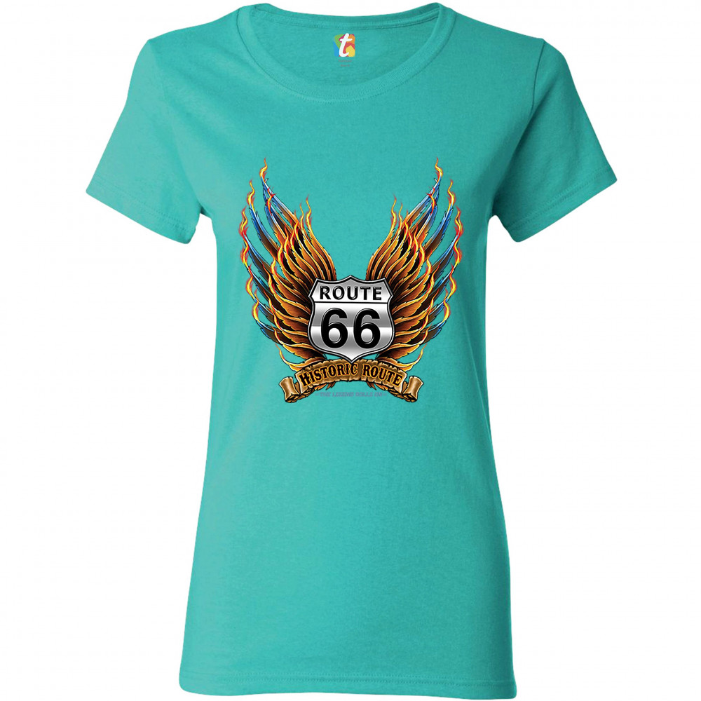 HISTORIC ROUTE 66 t-shirt the legend rolls on the mother road women's tee light blue