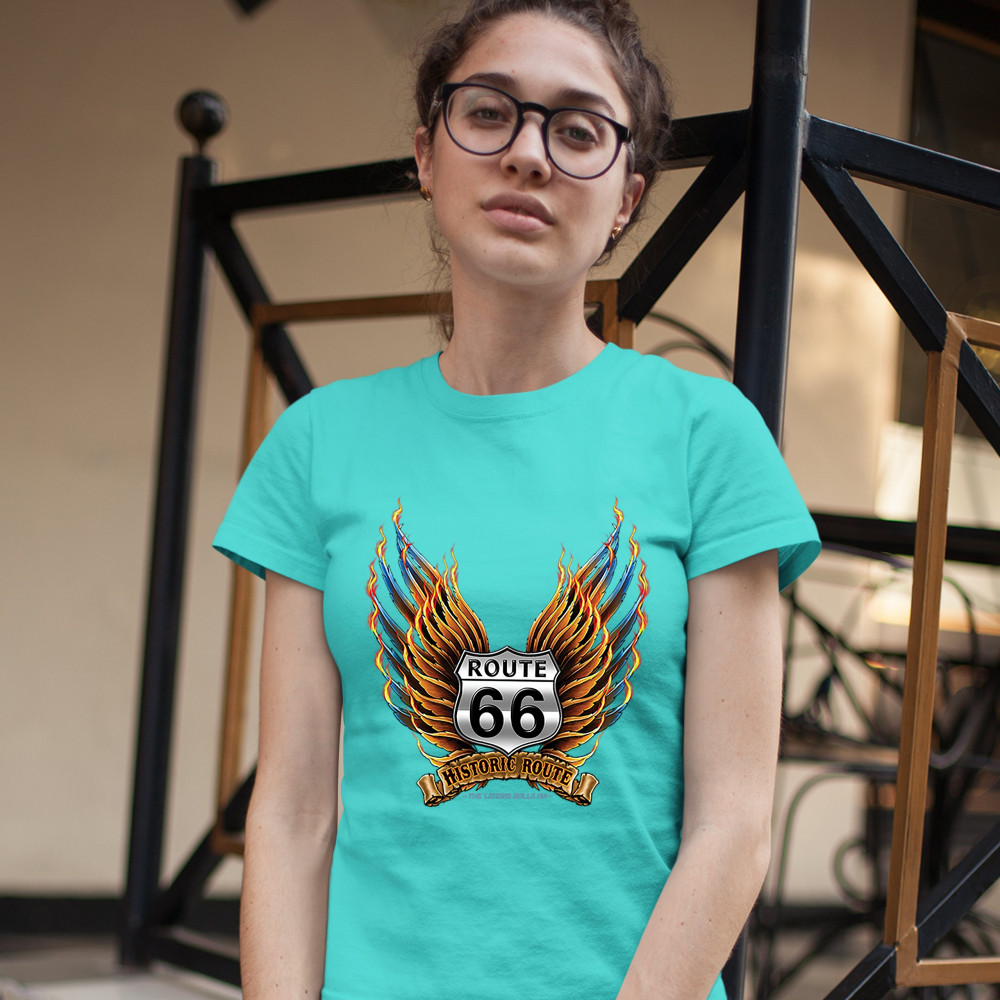 A print featuring a Route 66 sign with wings set on fire. The print says: "Historic Route, The Legend Rolls On". A great choice for a fan of the legendary Mother Road.