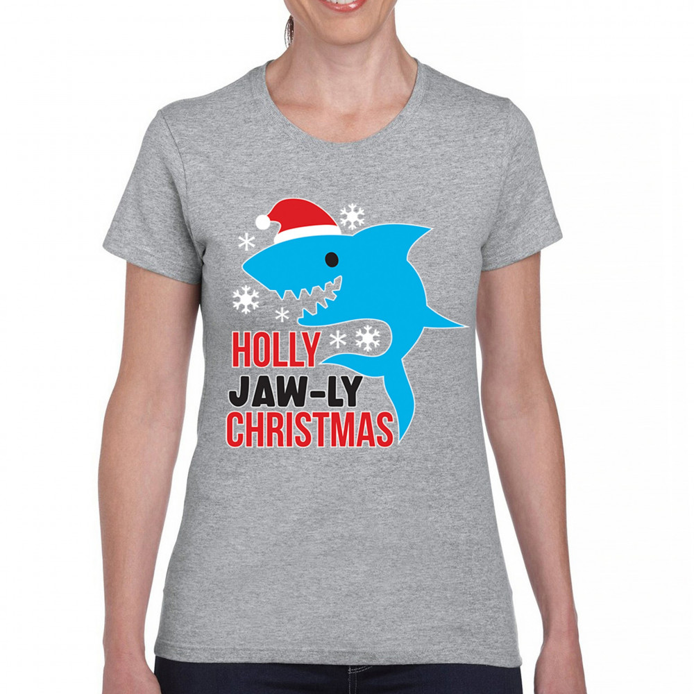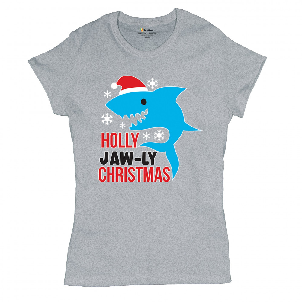 A fun Holly Jaw-ly Christmas design featuring a cheerful shark in a Santa hat with bright snowflake accents. Ideal for beach lovers, ocean fans, pun humor enthusiasts, Christmas parties, festive gatherings, white elephant events, and lighthearted winter celebrations. Brings a playful coastal vibe to holiday season outfits and gifts.